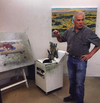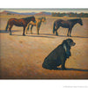 Howard Post draws from a collection of several thousand slides, from imagination, and then starts a canvas without preliminary sketches. Up to six colors might be used, painted over a dark background. His work is defined by orderly, strong shadow patterns cast by the figures of cattle, cowboys, trees, or fences.