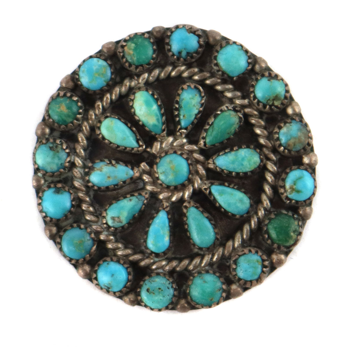 Zuni - Turquoise Petit Point Cluster and Silver Pin c. 1930-40s, 1" diameter