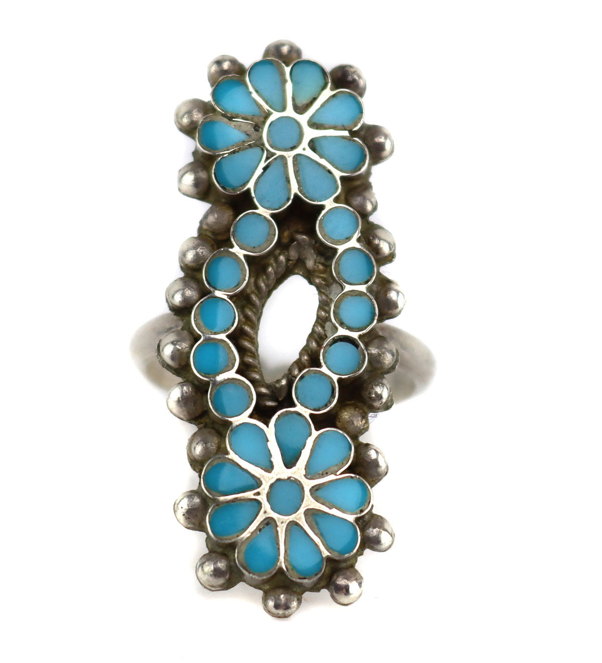 Dishta Family - Zuni - Turquoise Channel Inlay and Silver Ring with Flower Design c. 1950s, size 8