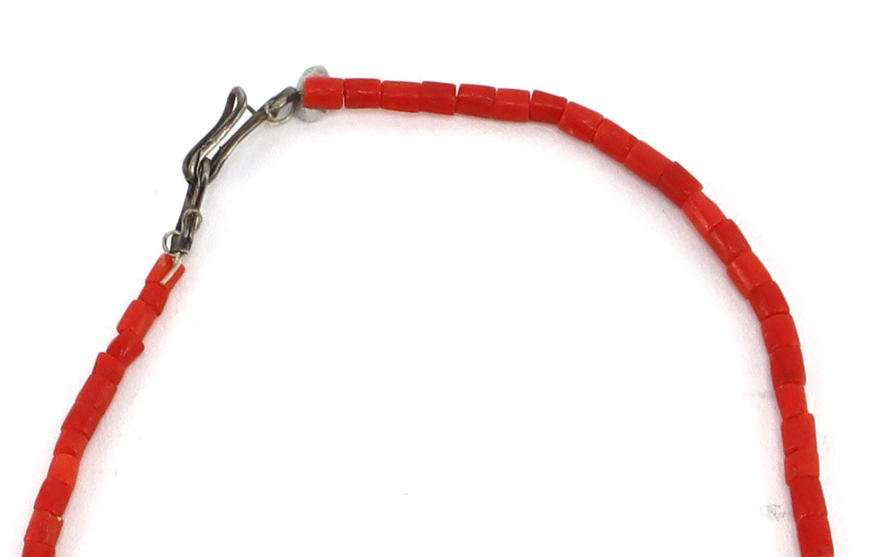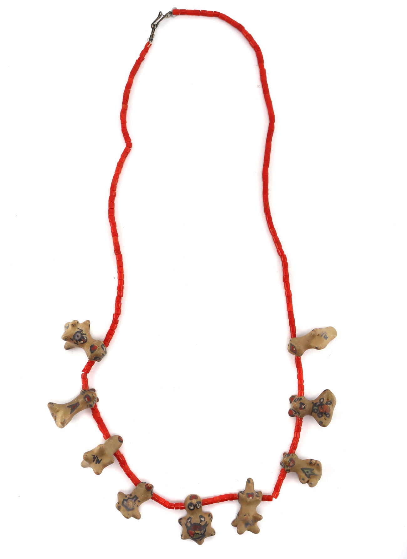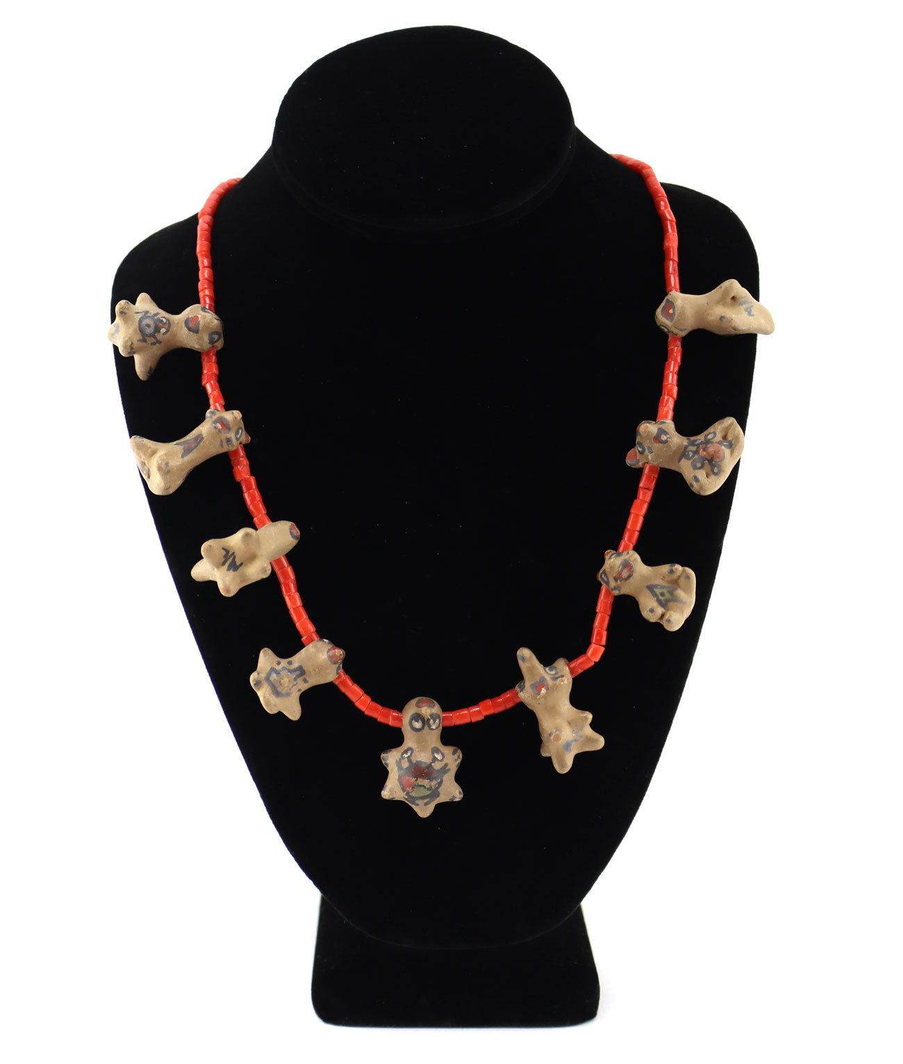 Margaret (1936-2018) and Luther (1911-1987) Gutierrez - Santa Clara Polychrome Pottery and Coral Beaded Necklace with Animal Figures c. 1960s, 32" length