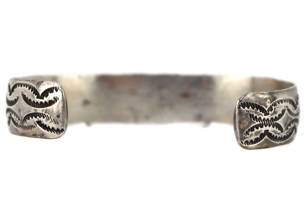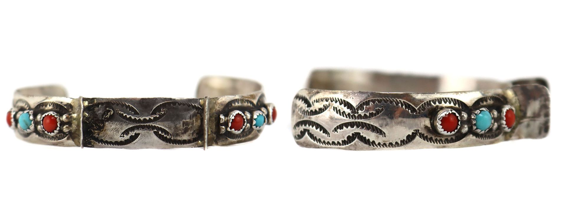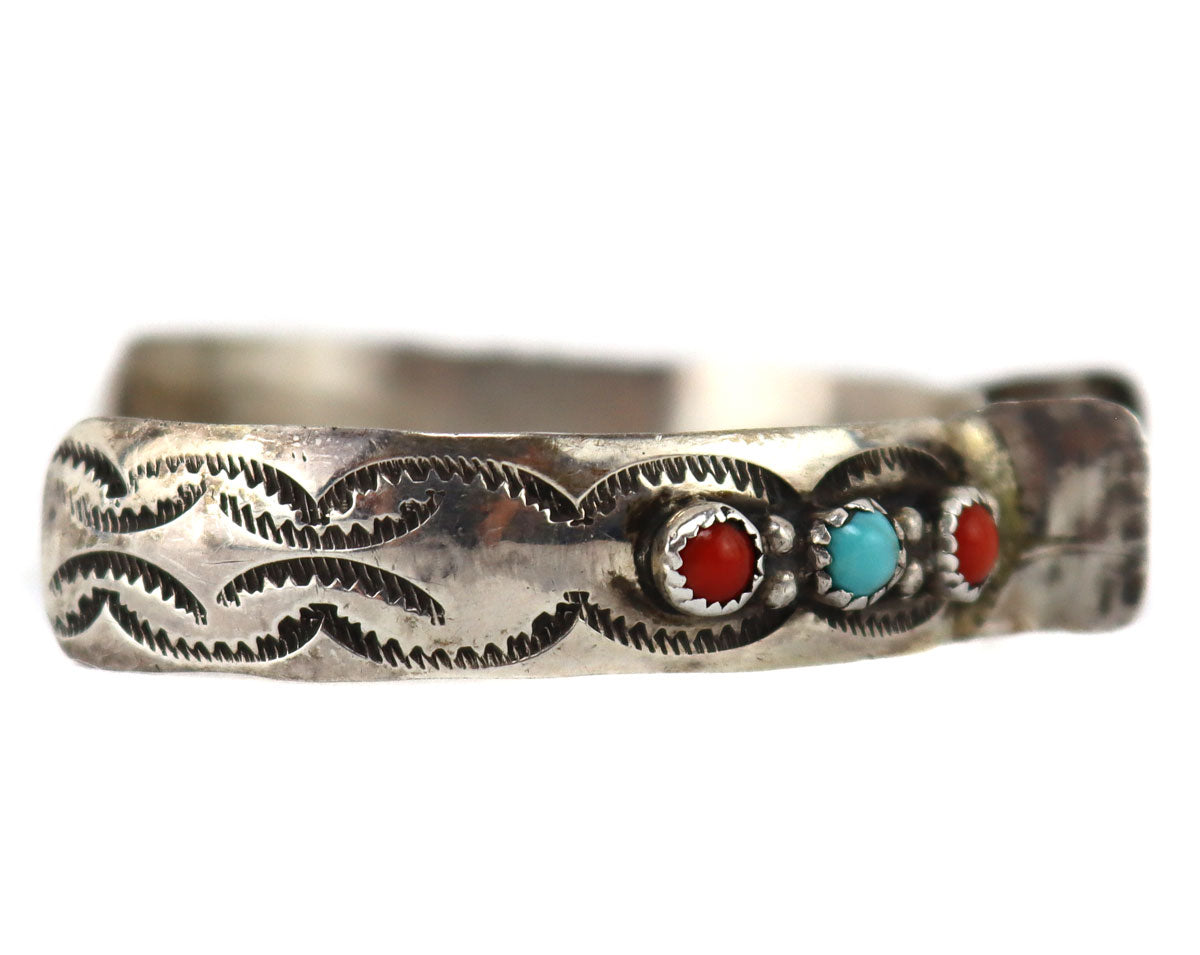 Navajo - Coral, Turquoise, and Silver Watchband with Stamped Design c. 1930-40s, size 6.25