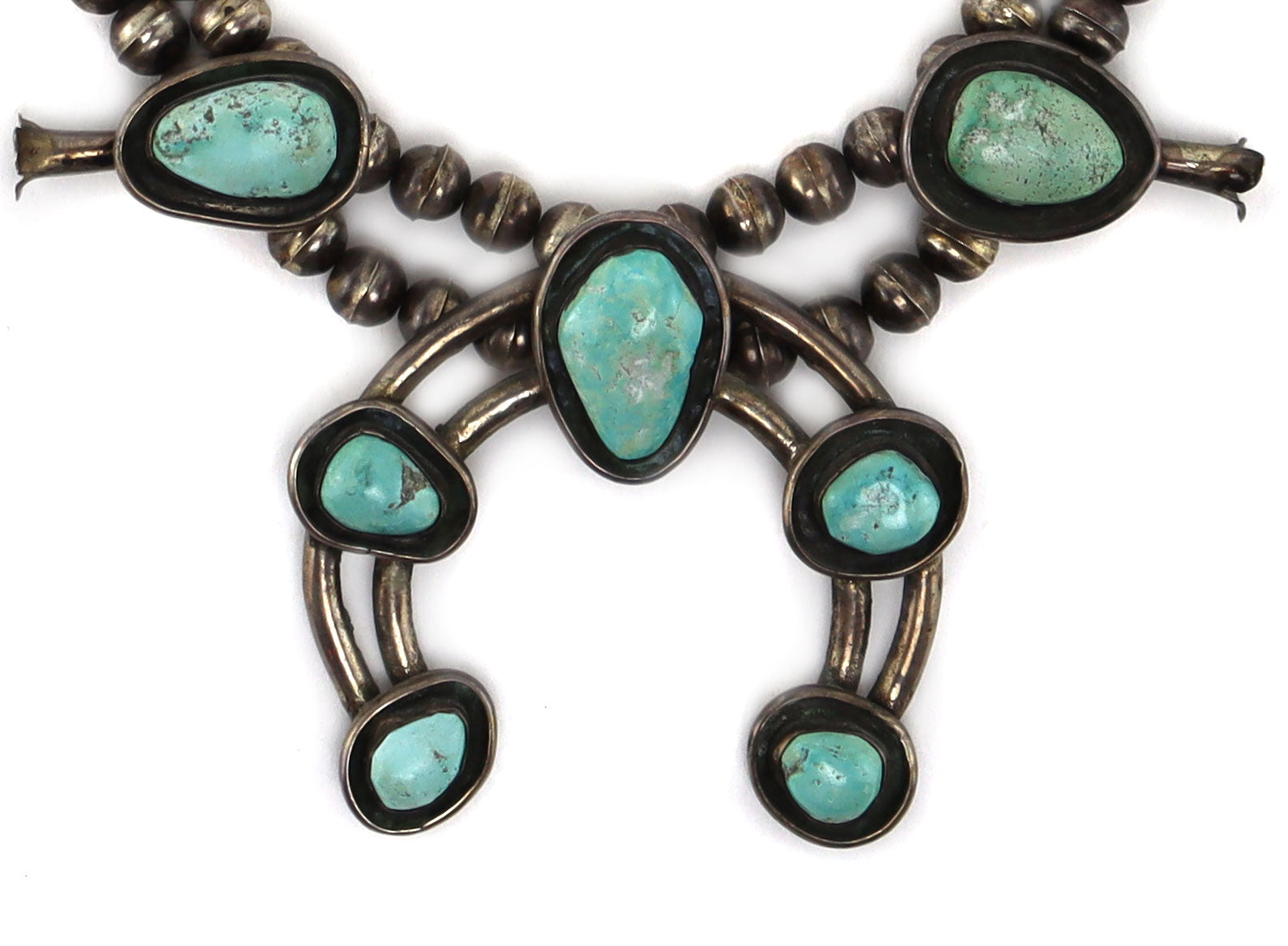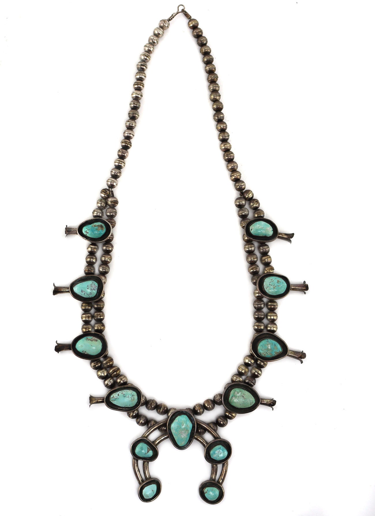Navajo - Turquoise and Silver Squash Blossom Necklace c. 1940-50s, 27" length