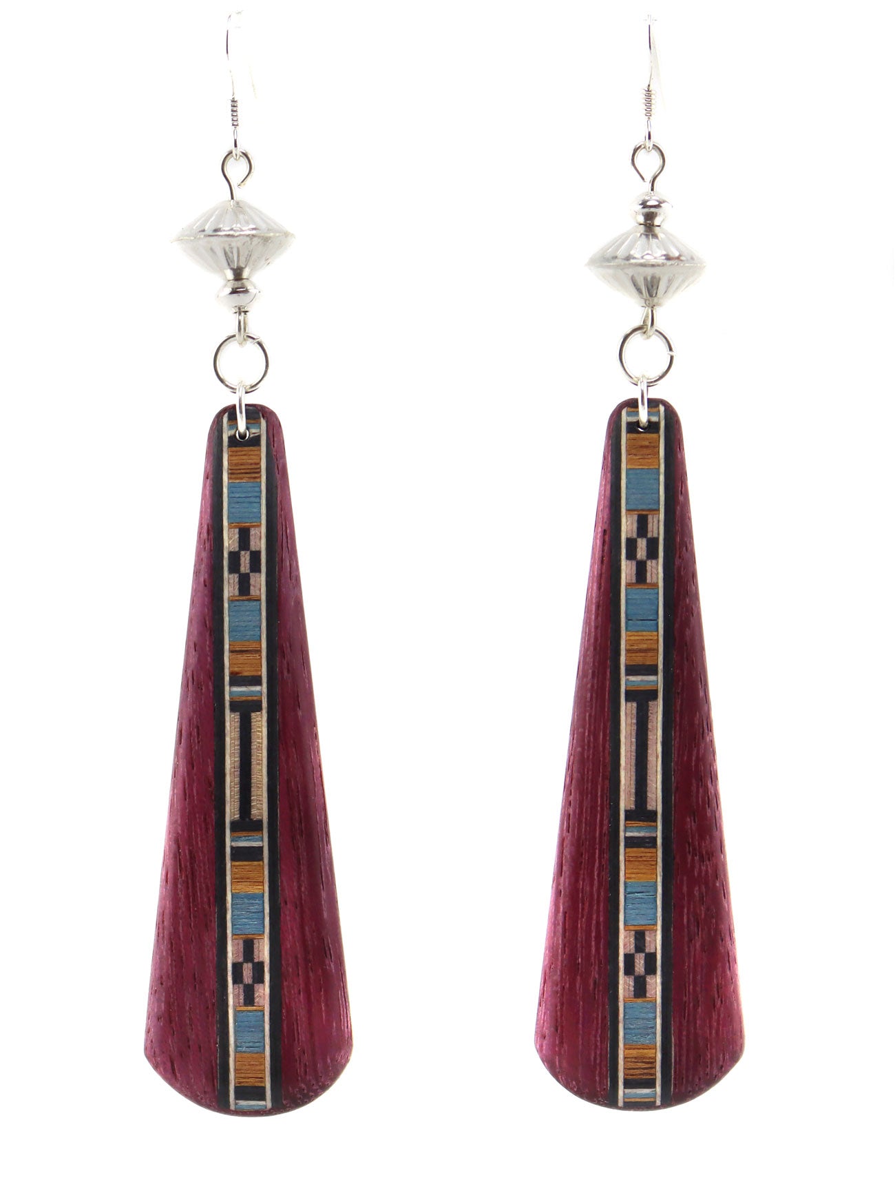 Ryan Gashweseoma - Hopi - Contemporary Wood Mosaic Inlay and Sterling Silver French Hook Earrings, 4" x 0.75"