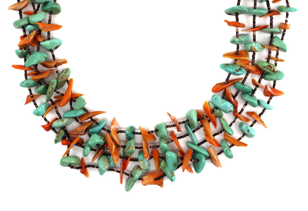 Santo Domingo (Kewa) - 4-Strand Turquoise, Spiny Oyster, and Pen Shell Heishi Necklace c. 1960s, 34" length