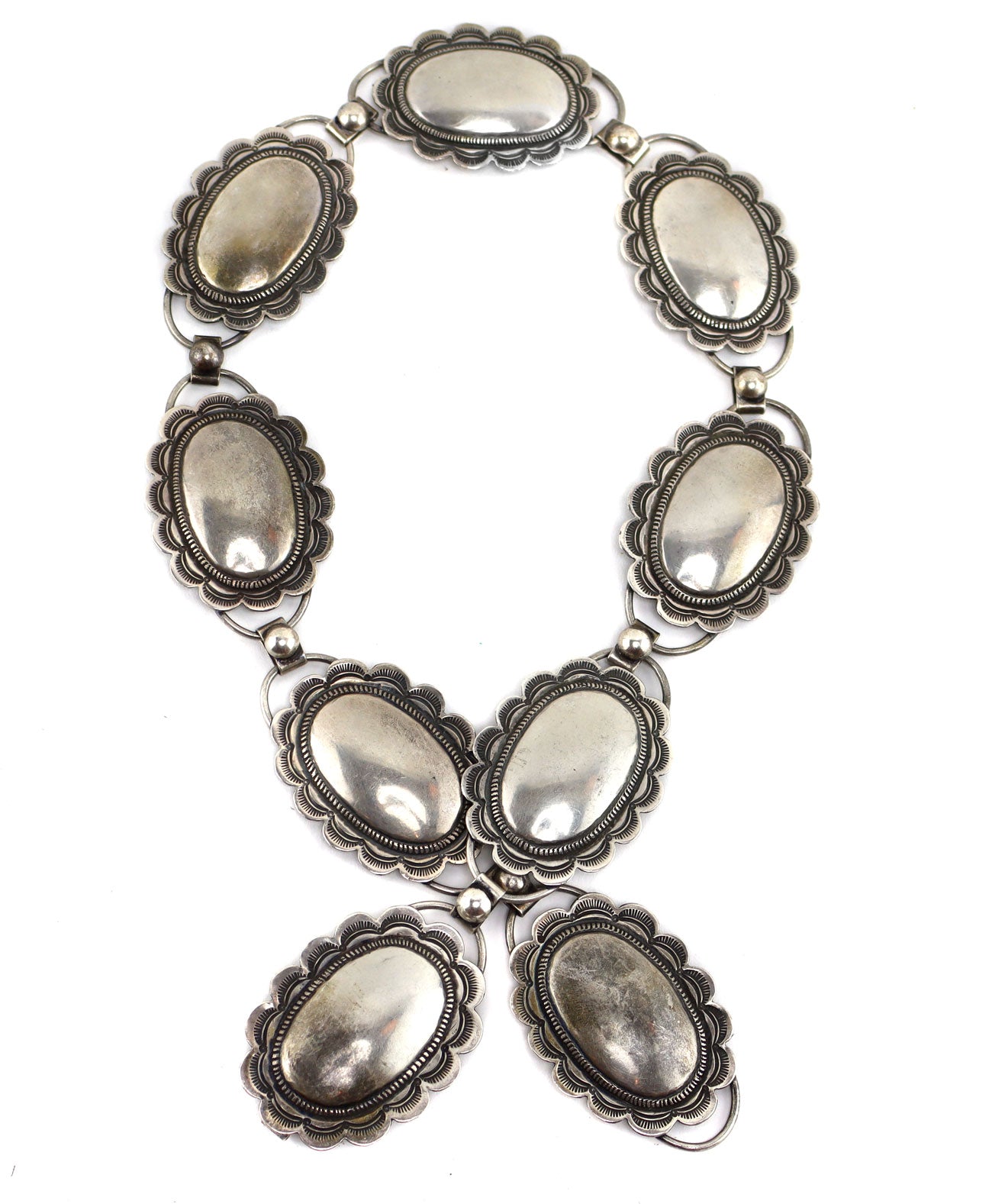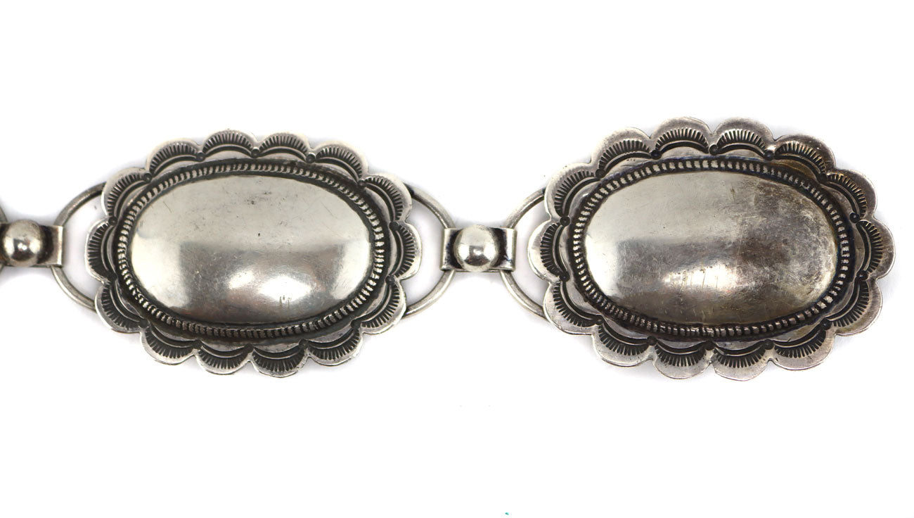 156g, 25" length. The conchos measure 1.625" x 2.625" each. Hallmarked with the Thunderbird Shop symbol on verso. Ex Arizona collection.