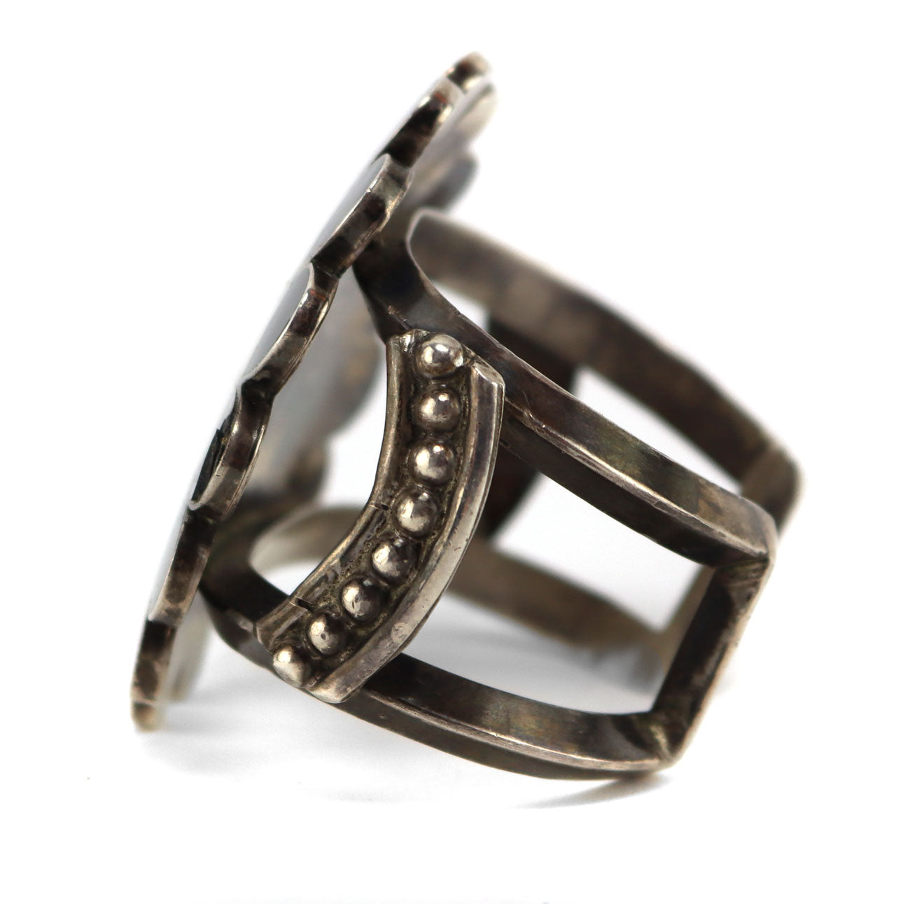 100g, 2.75" bandwidth, size 7 to include a 1" gap. Includes mother of pearl, turquoise, coral, and jet. Ex Arizona collection.