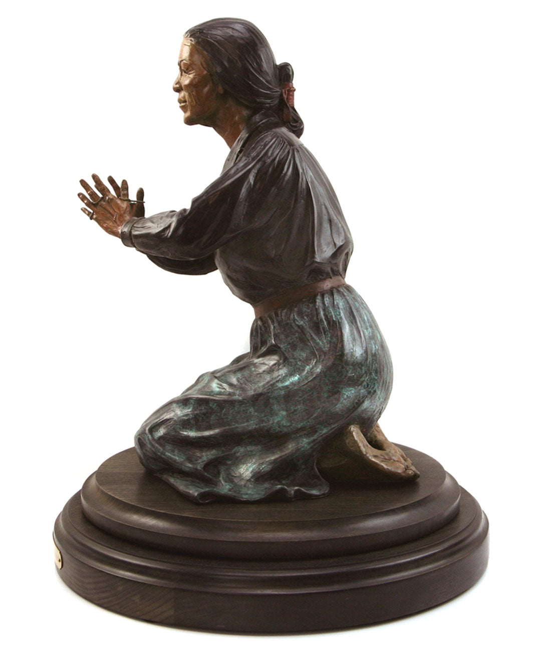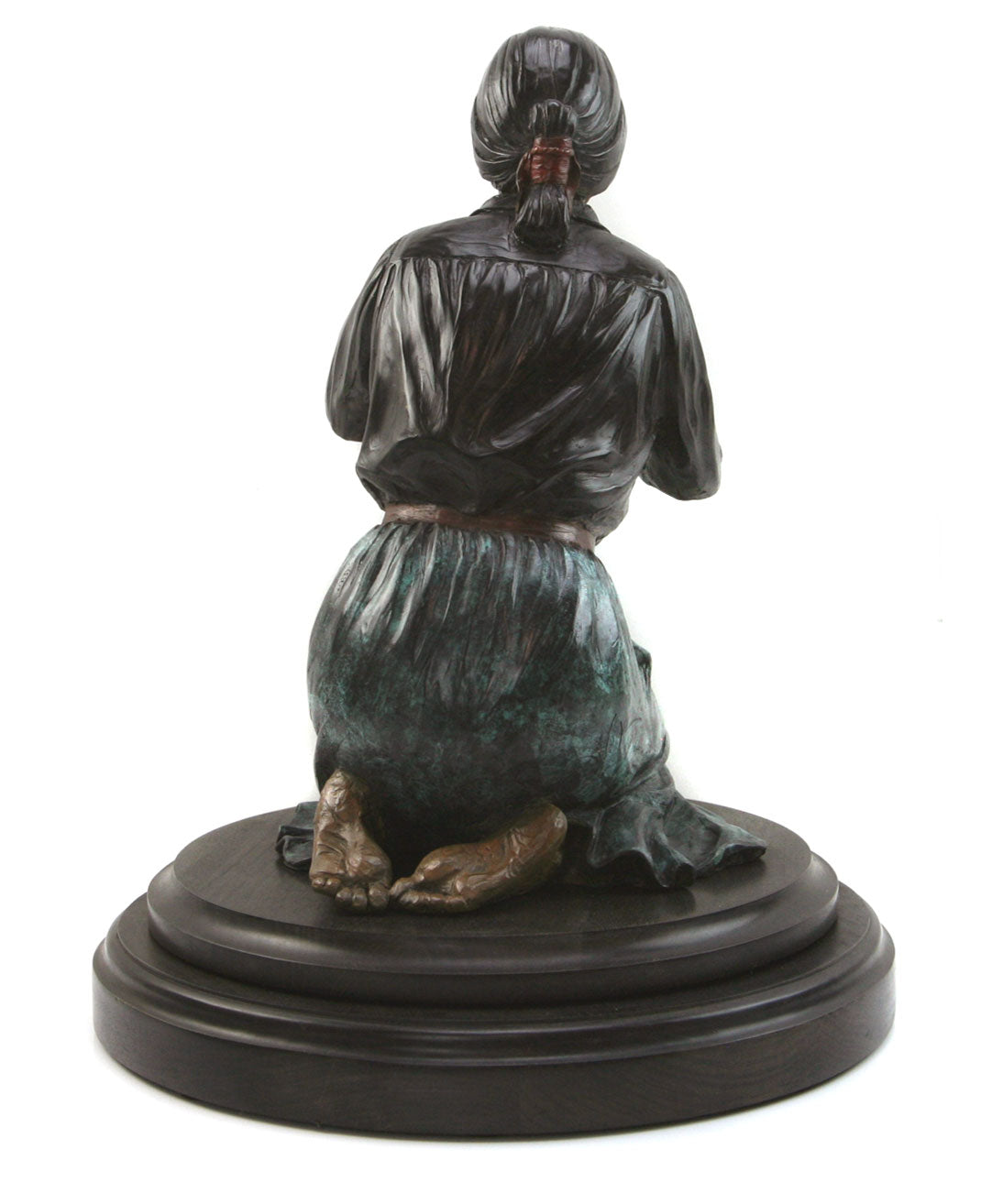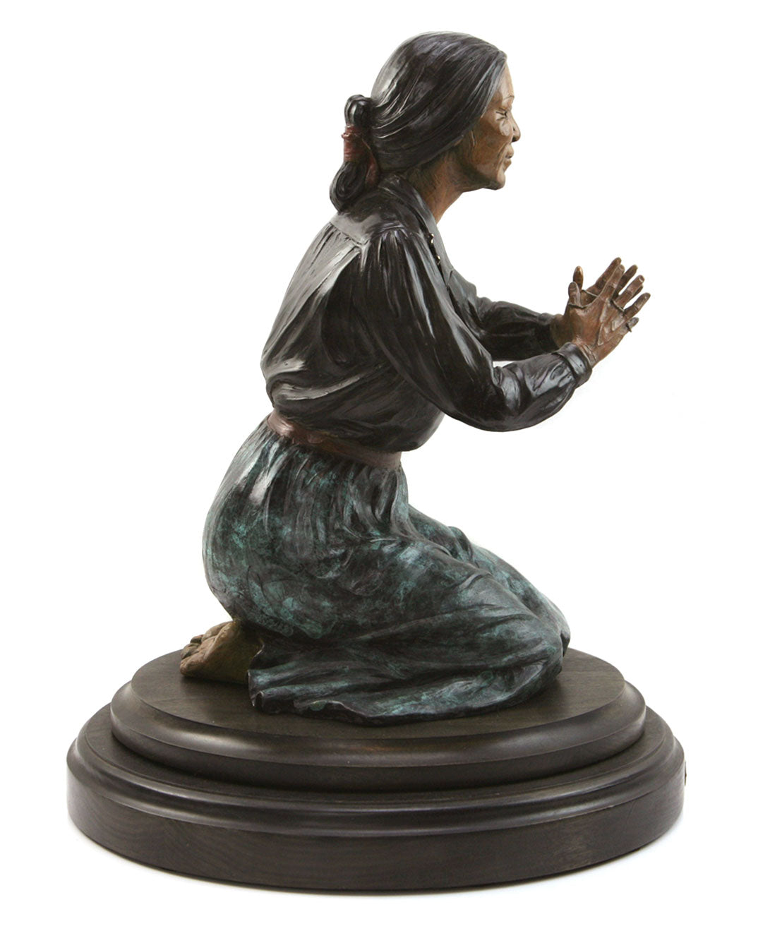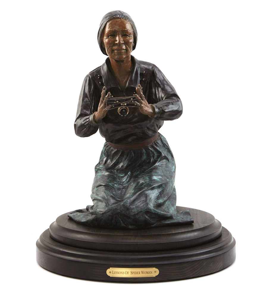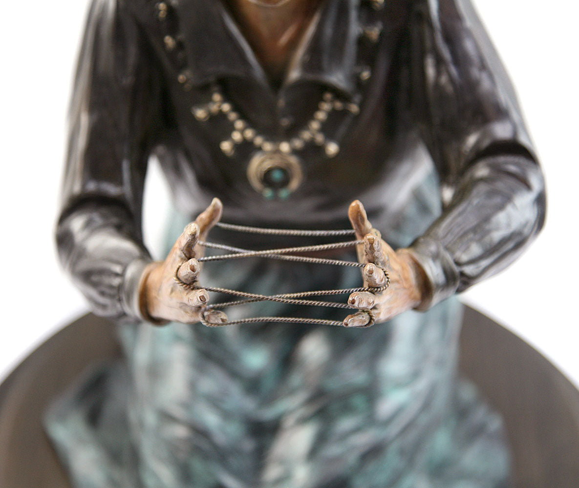 "Wintertime was storytelling time for the Navajo. In the evenings, the children would eagerly gather around the fire in the hogan to listen to their grandparents relate tribal legends. Frequently, the elders would illustrate figures in the tales with designs made from a piece of string. In this sculpture, a grandmother is telling the tale of how the Navajo gods of creation made the stars as she begins to shape a star design out of a cat's cradle. According to Navajo mythology, when the other gods asked Black God to fill the dark night sky with stars to make it beautiful, he took a single bright crystal from a fawn-skin pouch and placed it precisely in the north. It became North Fire, the star that never moves, which guides the nighttime traveler. Next, he placed other stars in patterns that formed the constellations. It was left to the supernatural spirit Spider Woman to teach the Dineh (Navajo for The People) the relationship of the stellar constellations to nature. From her, they learned that by observing how the positions of the stars changed through the seasons, they would know when to plant and when to harvest. Spring games were a popular form of amusement for the Navajo - but only in the months between October and April ("when the Spider People are at rest," says Navajo lore). Many a winter evening was pleasantly passed with a grandmother teaching her grandchildren the lessons of Spider Woman." - Star Liana York.