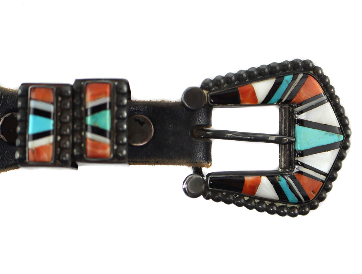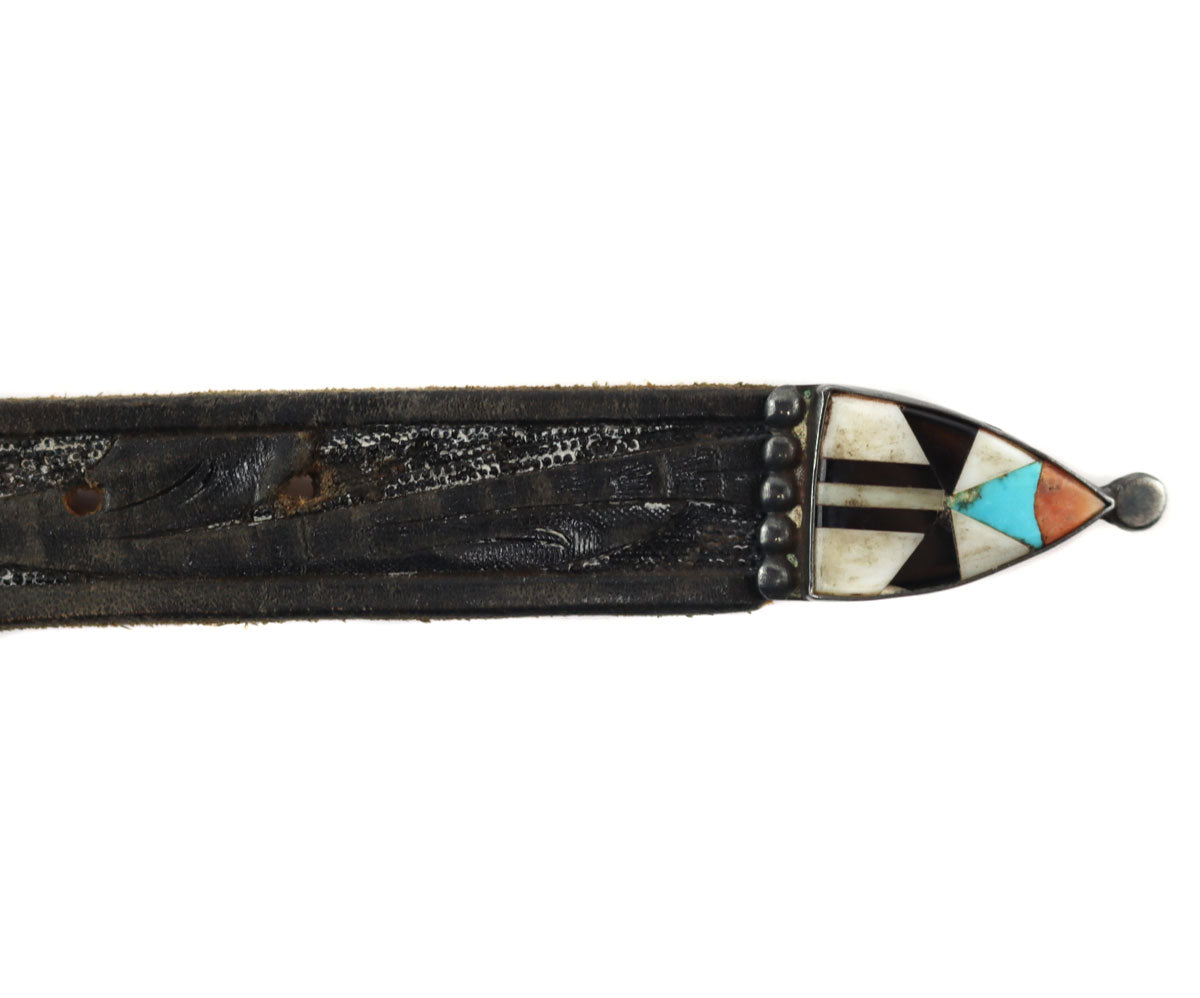 Zuni - Multi-Stone Inlay, Silver, and Hand-Tooled Leather Child's Belt c. 1940s, 25.25" - 29.75" waist