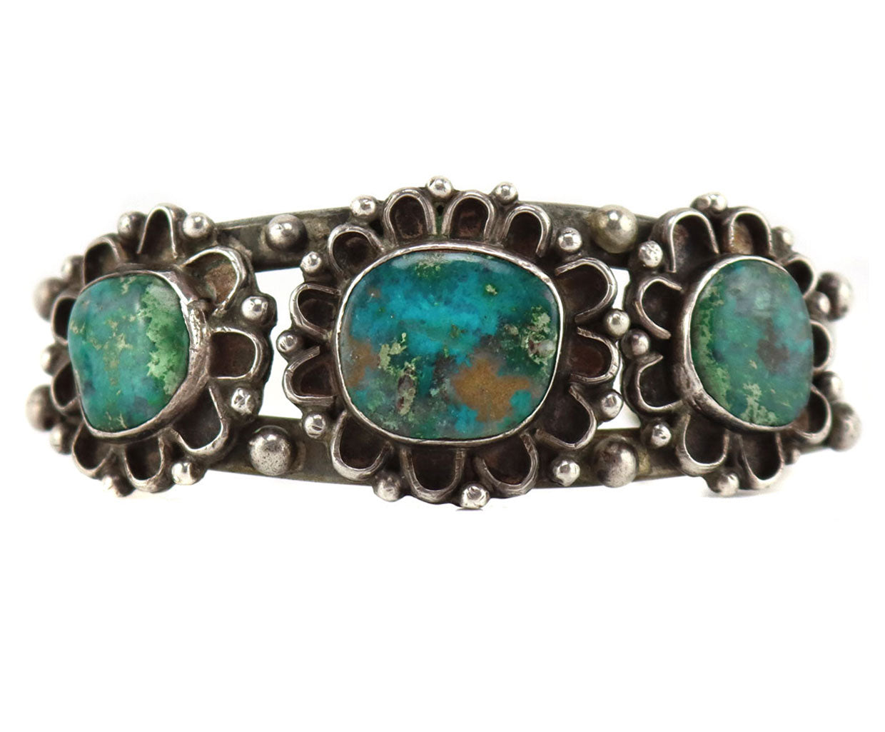 Navajo - Turquoise and Silver Bracelet with Flower Design c. 1950s, size 6.5