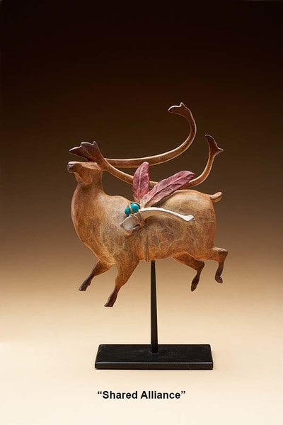 11.75The creation of fetishes, effigies, and talismans goes back to the earliest evidence of mankind. The compulsion to make aesthetic objects displays the creative spark that distinguished Homo sapiens from Neanderthals; it is a unique providence of the human mind. First expressed in stone carvings and cave wall paintings from the Paleolithic Period, it has continued throughout the centuries and across all cultures. When mankind is in tune with the natural environment, he is acutely aware of the strengths inherent in other species in order to learn useful survival skills . . . such as the bear for finding healing herbs, the coyote for clever prowess, the deer for evasive tactics. By creating their likeness, the recreation becomes the physical embodiment for the particular characteristic the animal symbolizes for the maker. And, as every creature has its unique qualities, so have other elements such as stone, feather and bone, which when added to the fetish increases its significance. The object then has become the recipient vessel of the energy given it, spiritual liaison for the bearer, containing the energy. This magic spark can then be called upon when needed, whether it be courage, fortitude, clarity in vision or healing powers. As an extension of this most primal understanding that goes back to the very roots of our being, I feel that all objects of art contain an energy endowed by it's maker. It is this very mystery I wished to explore in this body of work, and encourage viewers to contemplate. It is partly influenced by those contemporary artists who have reminded me of these mysterious corners of my mind, but mostly by the ancients whose brilliance fascinates and inspires me above all, and on whose shoulders we all stand.