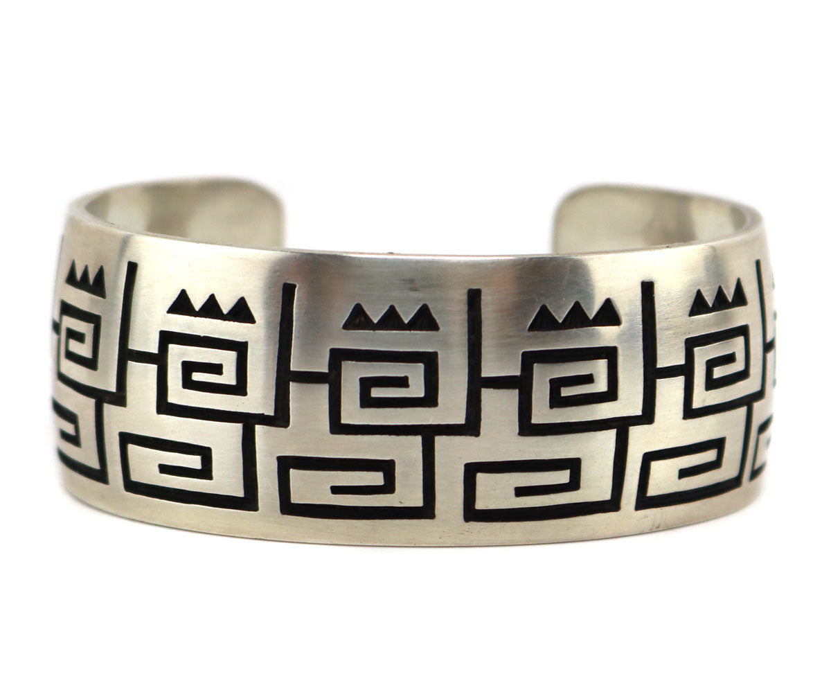Harold Lomayaktewa - Hopi - Sterling Silver Overlay Bracelet with Pictorial Designs c. 1980-90s, size 6.75