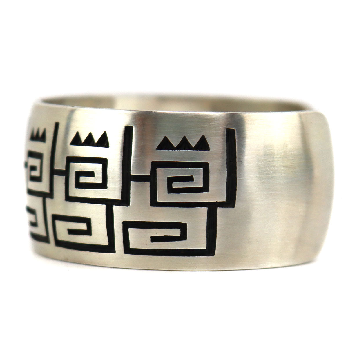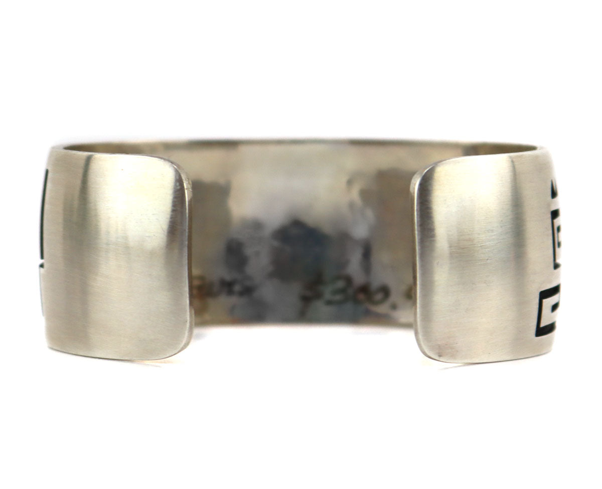 54.1g, 1" bandwidth, size 6.75 to include a 1" gap. Artist hallmark on verso. Ex Arizona collection. The previous owner acquired this piece from Alph Secakuku in Second Mesa, Arizona. Her husband was the former owner of a multi-generational Native American arts and crafts business, starting with his grandparents. During his life, he worked as an educator, Assistant to the Director of the Lowie Museum of Anthropology (now Phoebe Apperson Hearst Museum), and Director of the Arizona State Museum, all while maintaining his family business until his passing in 2008.