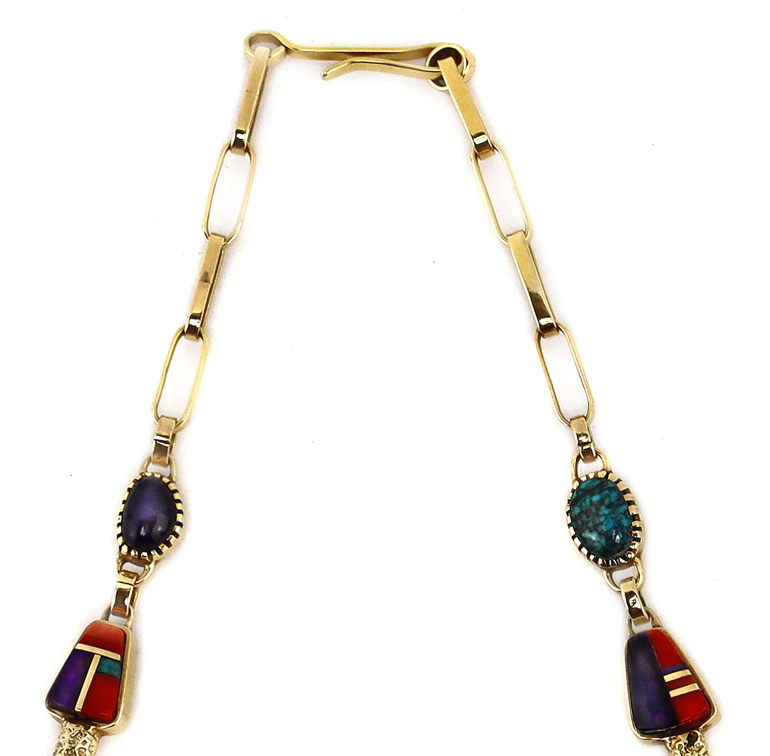 134.3g, 26" length. Stones include: turquoise, sugilite, spiny oyster, and coral. Artist hallmark on verso. Ex Texas collection.
