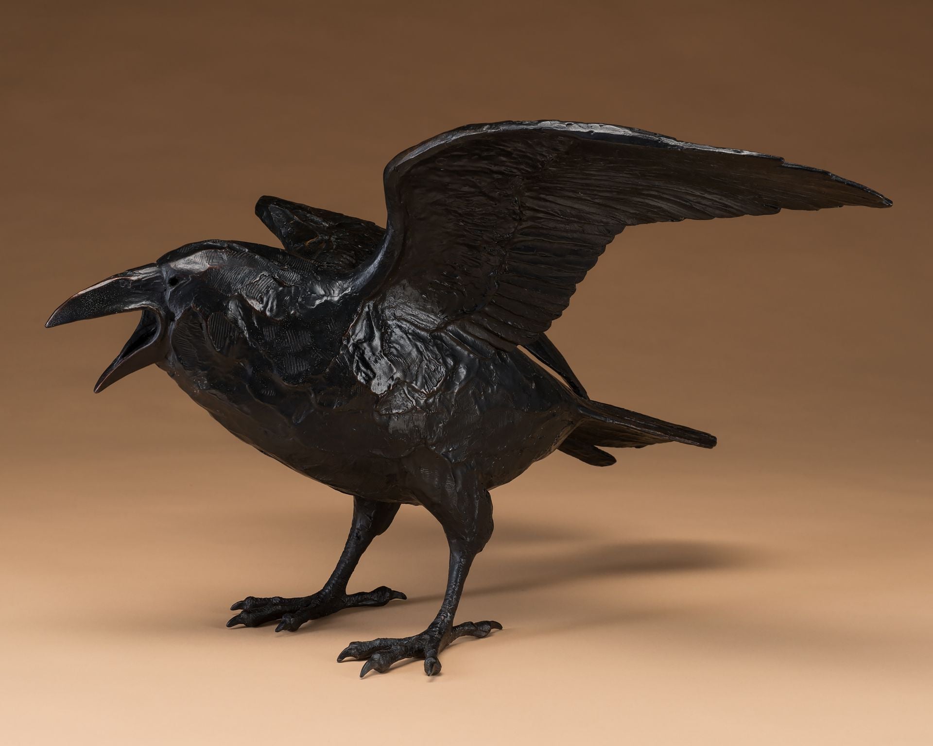 These Ravens often visit the huge cottonwood outside my studio and begin an amazing array of vocalizations….chattering away until I come out to interact with them. They sometimes will perch on the telephone poles at the entrance to our ranch, and when I go out to ride will chatter as if they wish me to acknowledge their presence. Sometimes they will fly along with us on the ride…..behavior which I find charming and beguiling indeed!" - Star Liana York