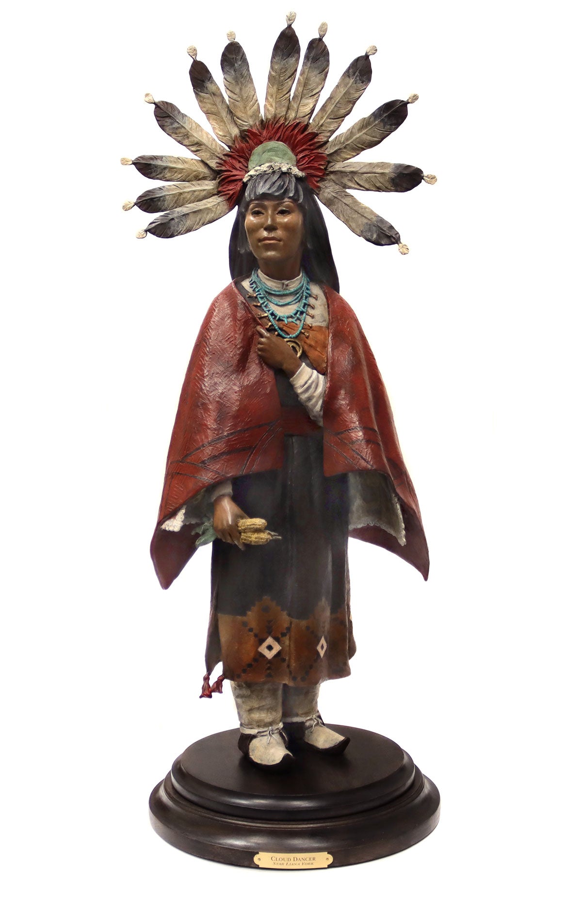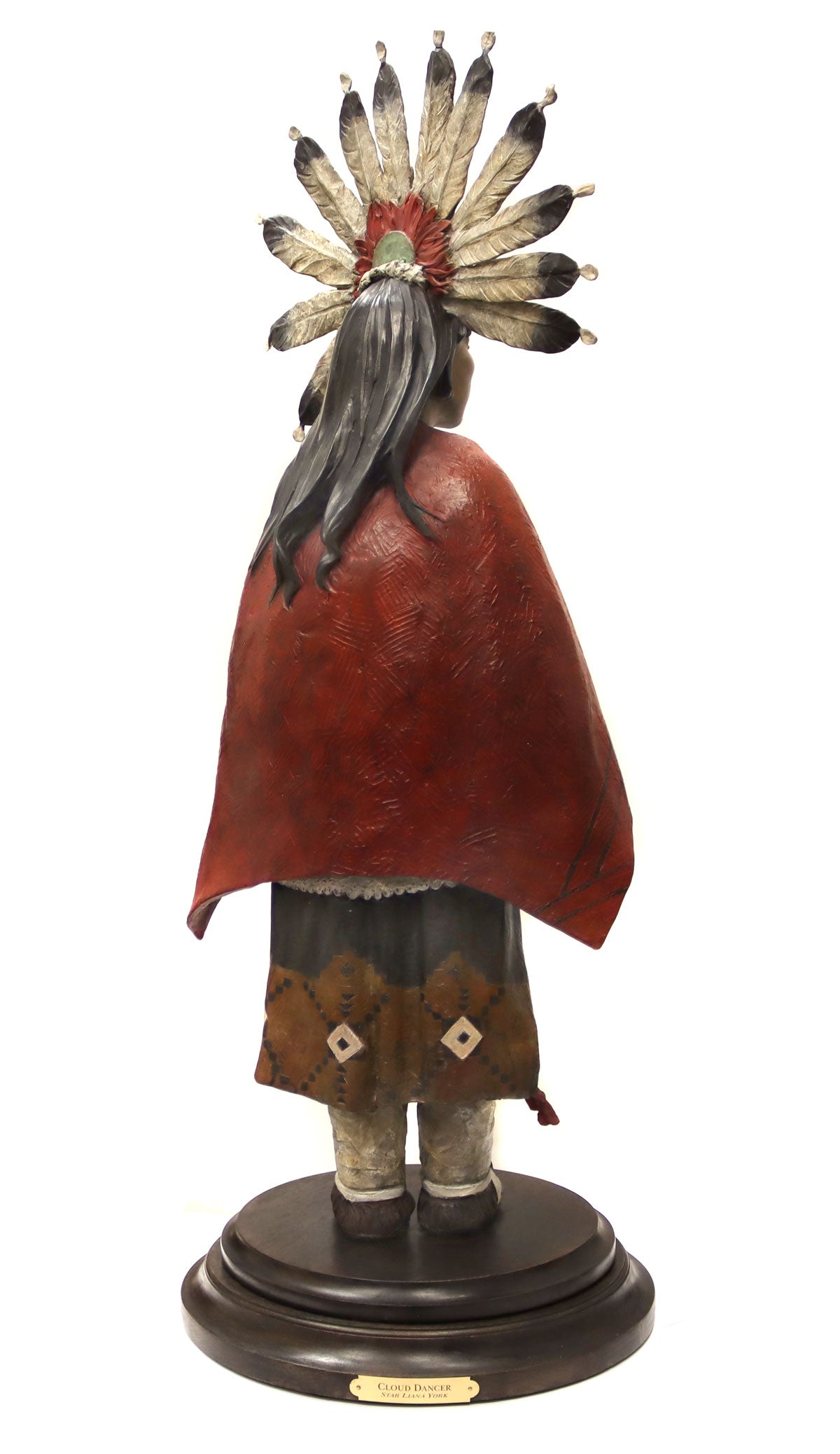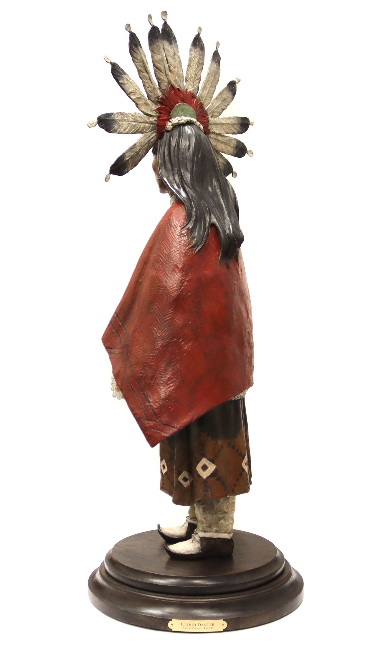 38.5"I don't work from models. Often I don't even have an image in mind of what the figure is supposed to look like when I start. The process has more to do with a peripheral vision, and recognizing and eliminating what's wrong to get at what's right." Before she began sculpting this piece, Star had been thinking about the situation confronting many Indian people today regarding their place in the modern world, and how that connects to their participation in rituals honoring traditional beliefs. "Cloud Dancer" was the result. There is a chill in the morning air at San Juan Pueblo, where the Cloud Dance, which is usually held in early spring because of its associations with agriculture, weather control and fertility, is about to begin. The women who will perform, some having thrown a blanket over their shoulders to stay warm, all wearing elaborate headdresses made of twelve eagle feathers in a fan on top of their heads and carrying ears of corn, slowly make their way toward the plaza where the male dancers are waiting. In that contemplative moment this young Pueblo woman takes the opportunity to reflect on the contentedness that follows from participation in an activity that will reinforce her sense of tribal belonging. In the serene expression that Star has given her, a wholeness radiates from within that is derived from having found a balance between past and present in her life." - Star Liana York