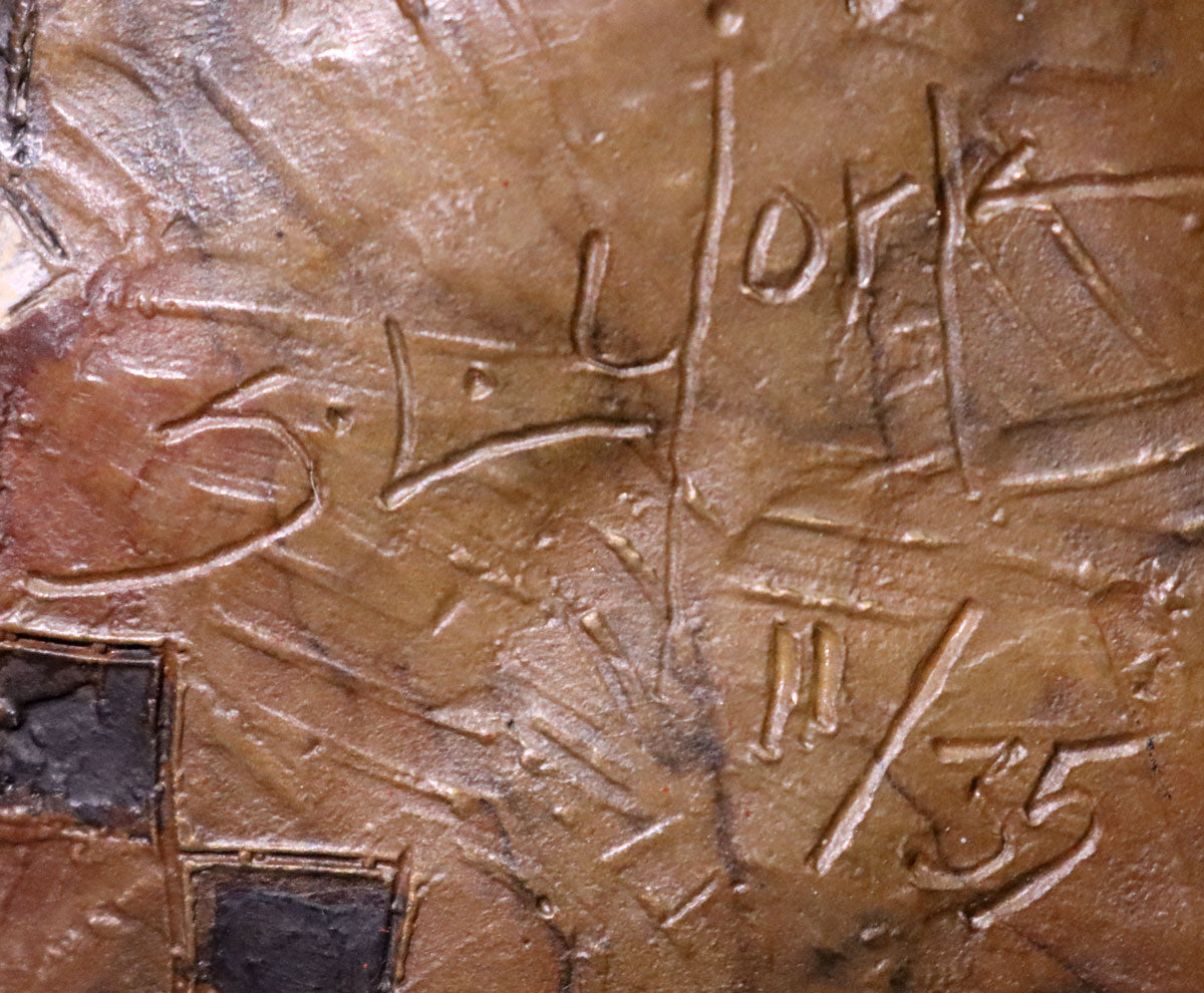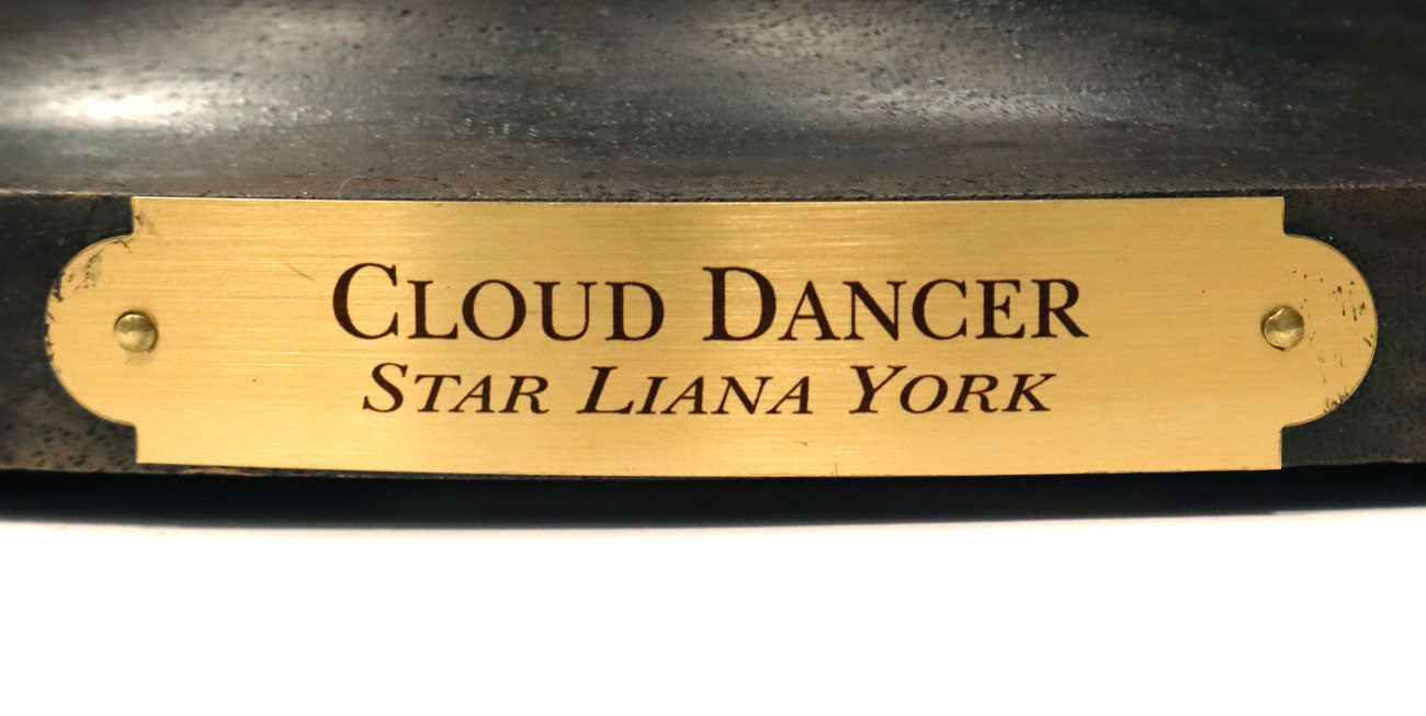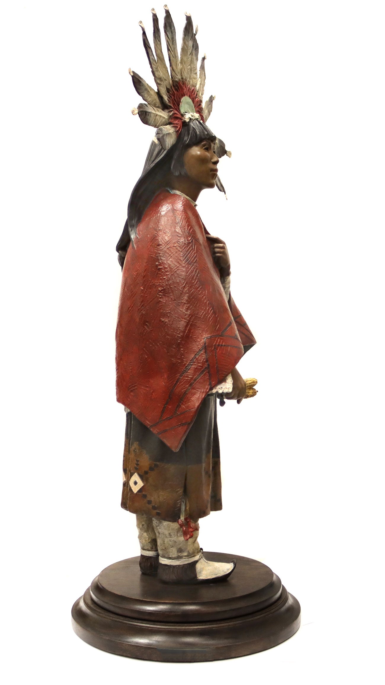 38.5"I don't work from models. Often I don't even have an image in mind of what the figure is supposed to look like when I start. The process has more to do with a peripheral vision, and recognizing and eliminating what's wrong to get at what's right." Before she began sculpting this piece, Star had been thinking about the situation confronting many Indian people today regarding their place in the modern world, and how that connects to their participation in rituals honoring traditional beliefs. "Cloud Dancer" was the result. There is a chill in the morning air at San Juan Pueblo, where the Cloud Dance, which is usually held in early spring because of its associations with agriculture, weather control and fertility, is about to begin. The women who will perform, some having thrown a blanket over their shoulders to stay warm, all wearing elaborate headdresses made of twelve eagle feathers in a fan on top of their heads and carrying ears of corn, slowly make their way toward the plaza where the male dancers are waiting. In that contemplative moment this young Pueblo woman takes the opportunity to reflect on the contentedness that follows from participation in an activity that will reinforce her sense of tribal belonging. In the serene expression that Star has given her, a wholeness radiates from within that is derived from having found a balance between past and present in her life." - Star Liana York