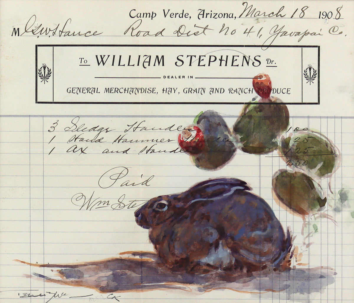 13.625" x 14.625" framed. Watercolor on original 1908 ledger paper.