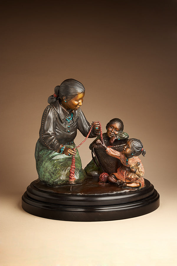 "Part of the process of turning wool into weave-able yarn is drawing out the “carded” wool after shearing the sheep into thinner, finer thread. It requires pulling the wool thru fingers with a twirling motion as it is wound onto a spindle. Nizhoni has become a young mother who teaches her own daughters by example as her mother showed her and her mother did her, going back generations. Before weaving into intricate patterns, the yarn may be dyed with natural pigments. These patterns are developed from a sense of aesthetic influenced by the dramatic beauty of the surrounding desert environment. The symbols used also reflect their beliefs & myths. Often the design may tell a story of either the tribe or family history that also incorporates their cultural values. So, not only does this mother pass along the skill of creating yarn and weaving fabric, but also she teaches the symbology of their culture." - Star Liana York