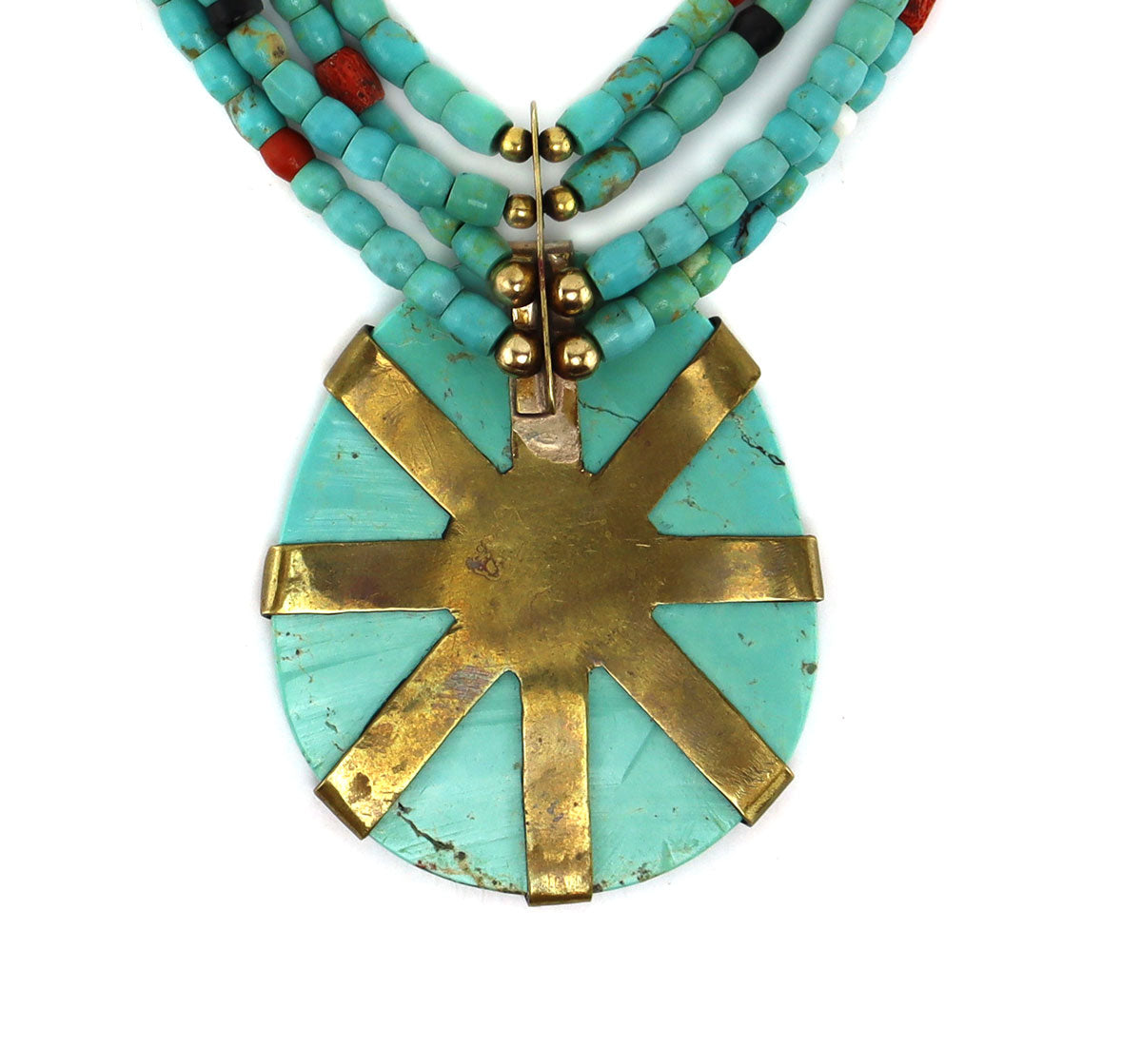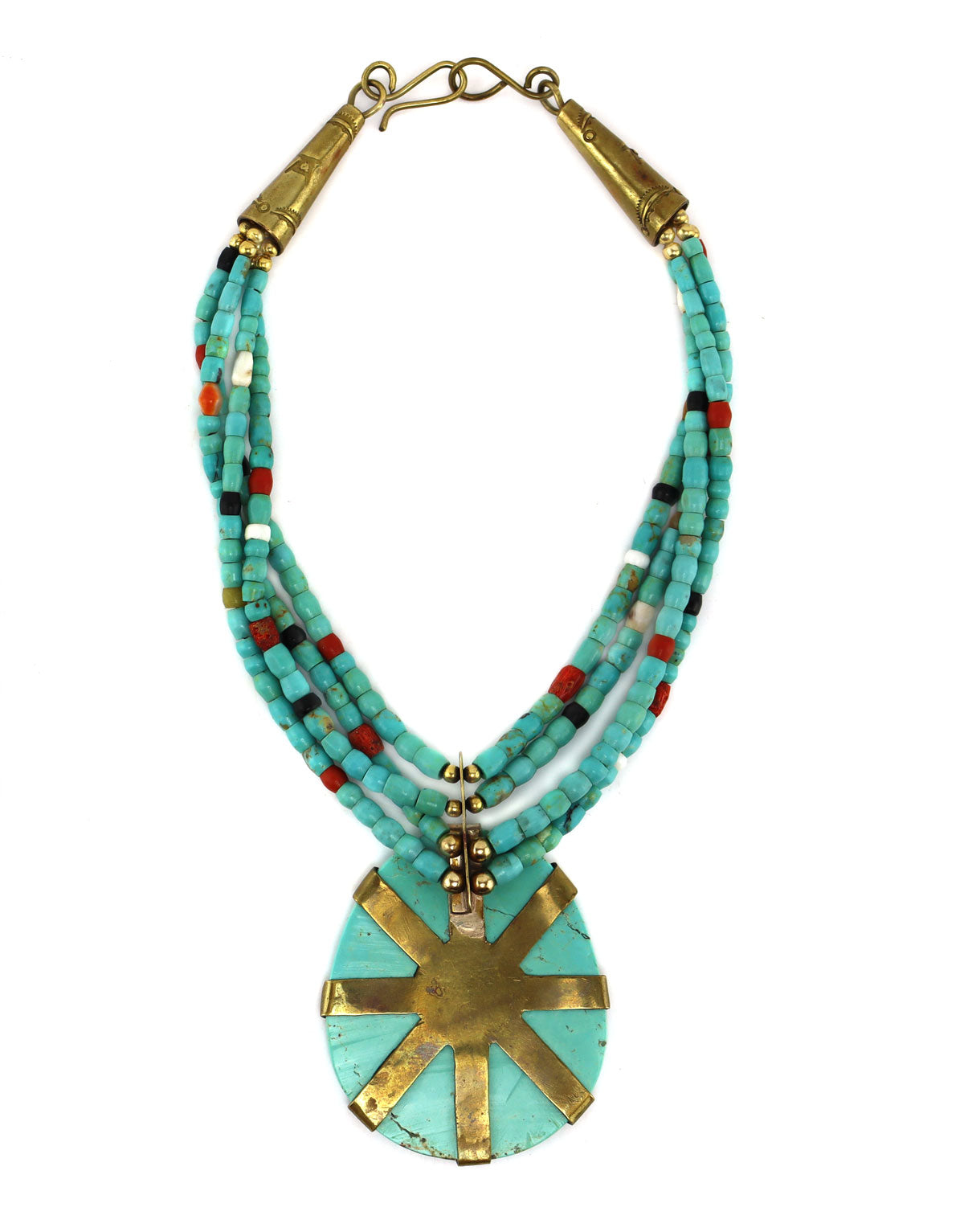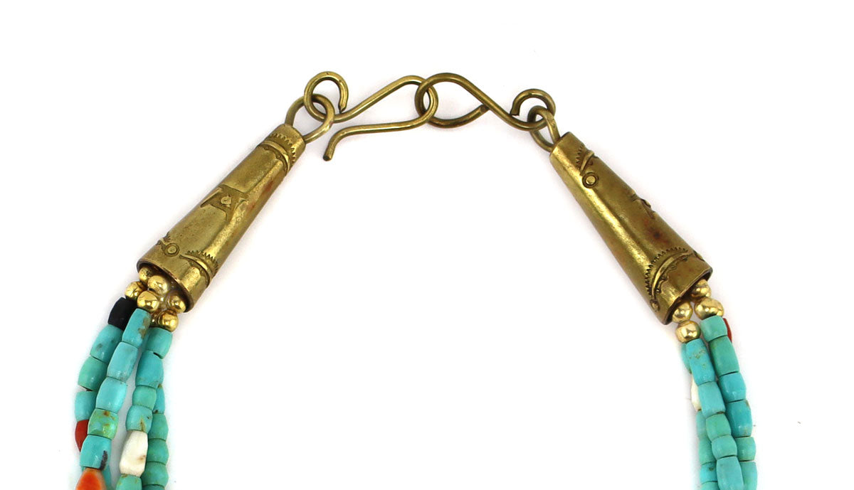Anthony "Tony" (1919-2002) or Wayne (b. 1966) Aguilar - Santo Domingo (Kewa) - 4-Strand Turquoise/Multi-Stone Beaded and Brass Necklace c. 1980-90s, 13.5" length