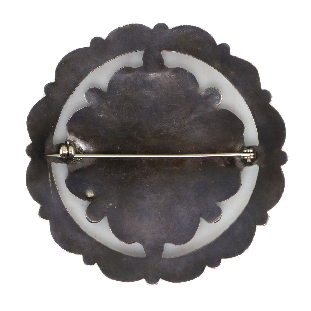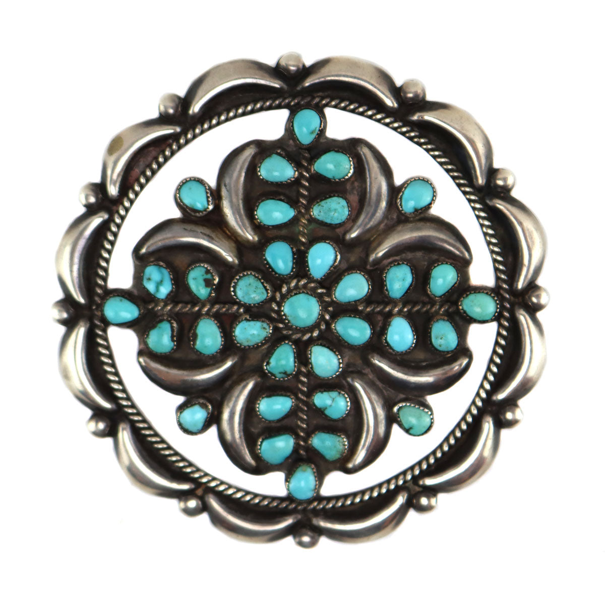 Attributed to the Ondelacy Family - Zuni - Turquoise Petit Point Cluster and Silver Pin c. 1950s, 2.625" diameter