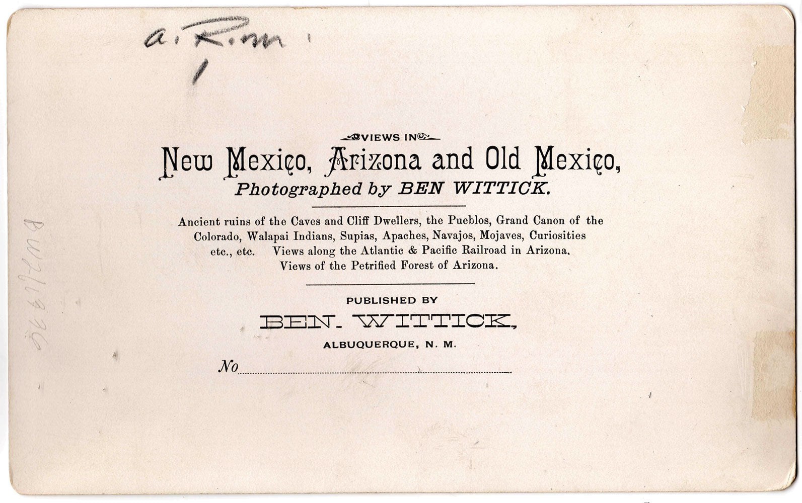 16.25" x 12.25" framed. Total cabinet card size is 8.5" x 5.25". Ben Wittick was a pioneer photographer of the American Southwest. This image, along with others in its collection, was a part of his "Views in New Mexico, Arizona, and Old Mexico" and represented life of Pueblo people in the late 19th century.