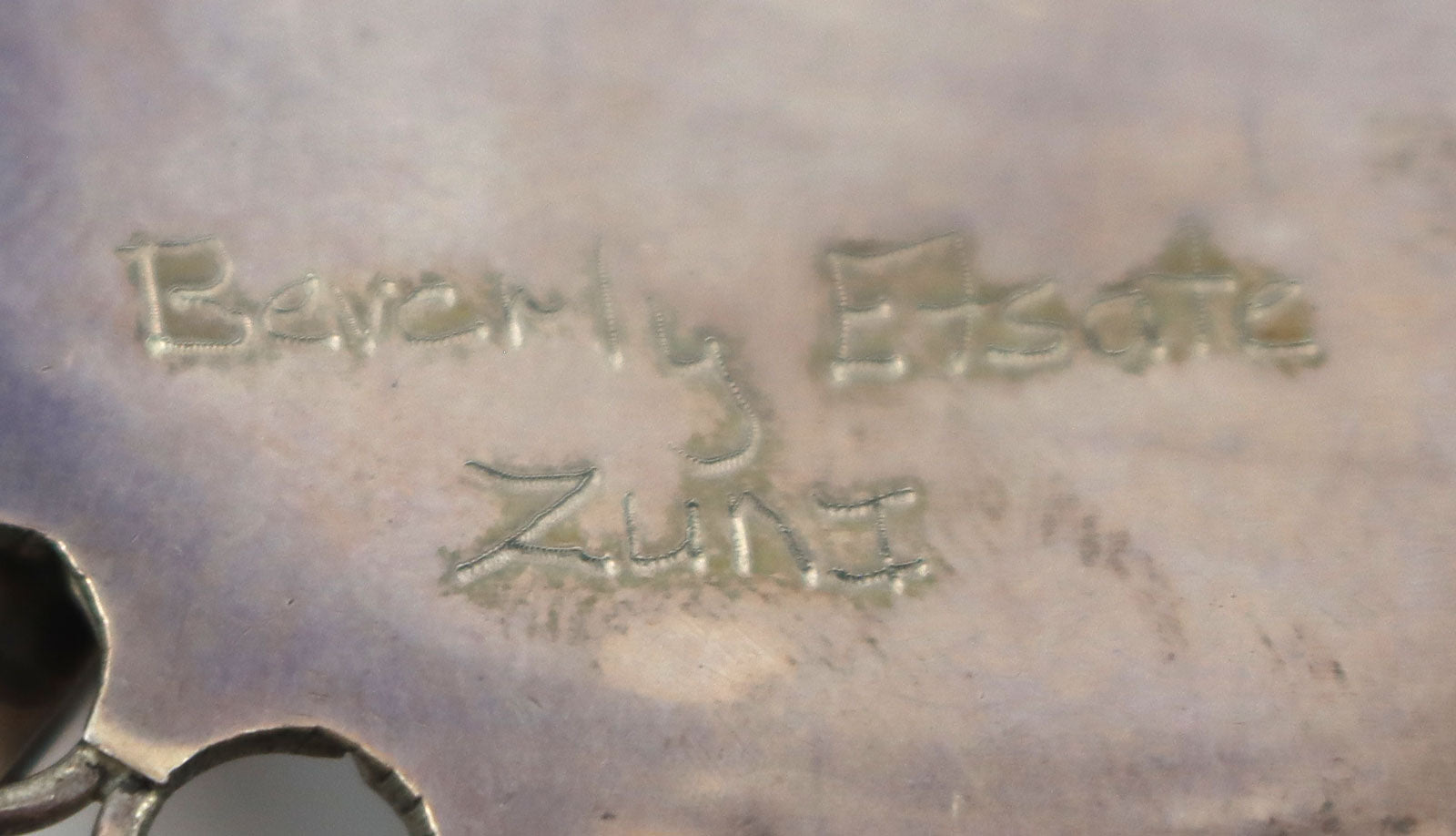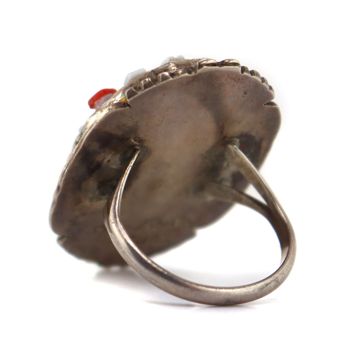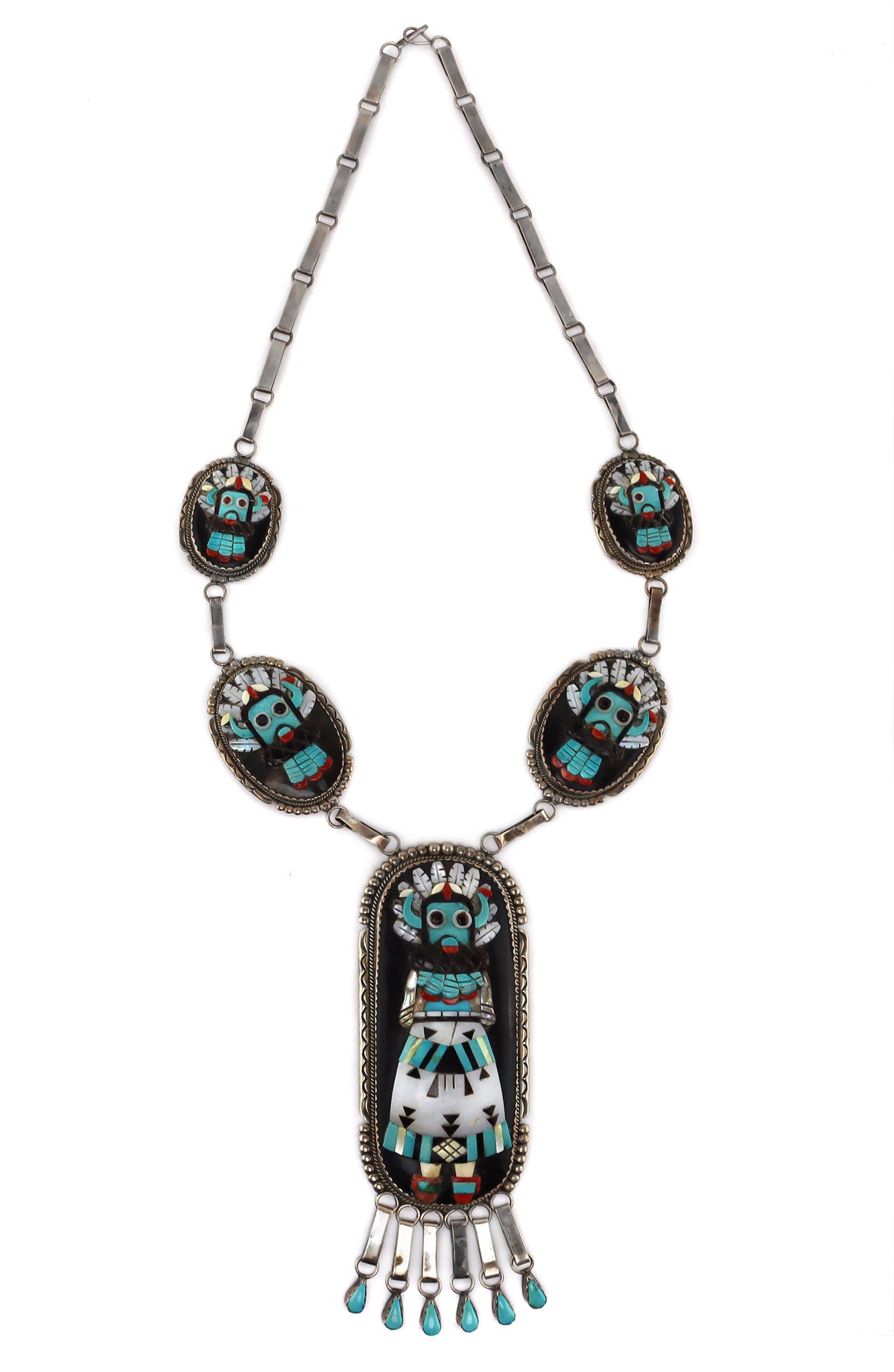 1970-80sMeasurements: (1.) Necklace: 162.7g, 25" length, 5.75" x 2" center pendant. Note: The eye of the upper right pendant is missing a stone. Please see photos. (2.) Bracelet: 47.2g, 2.125" bandwidth, size 6.5 to include a 1" gap. (3.) Ring: 9.9g, size 9, 1.375" x 1.125" face. (4.) Earrings: 10.7g, 2.5" x 1", each. Stones include turquoise, mother of pearl, coral, and jet. Hallmarked by the artist on verso.