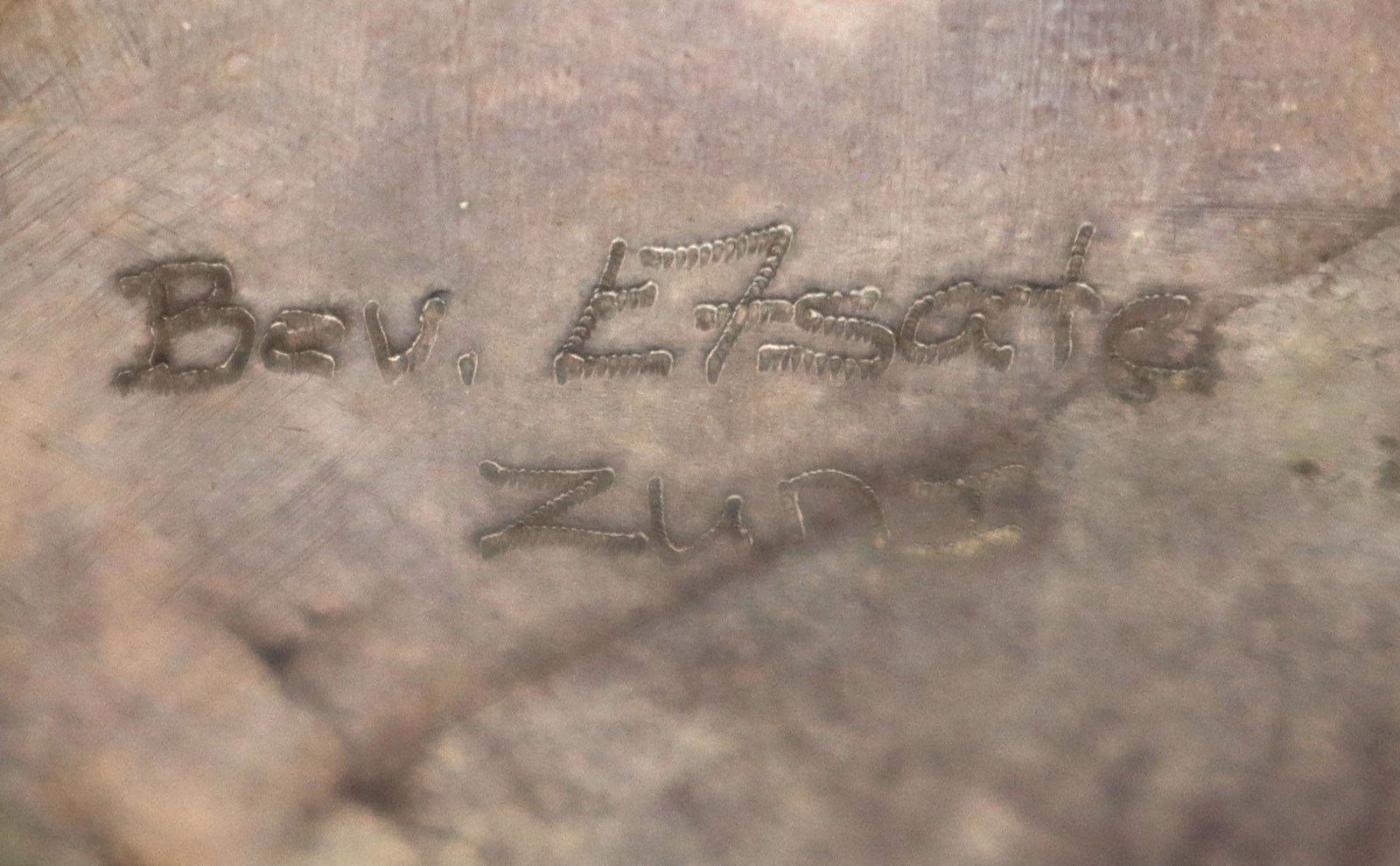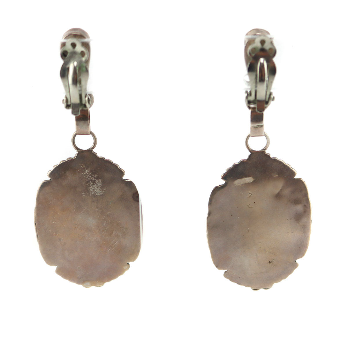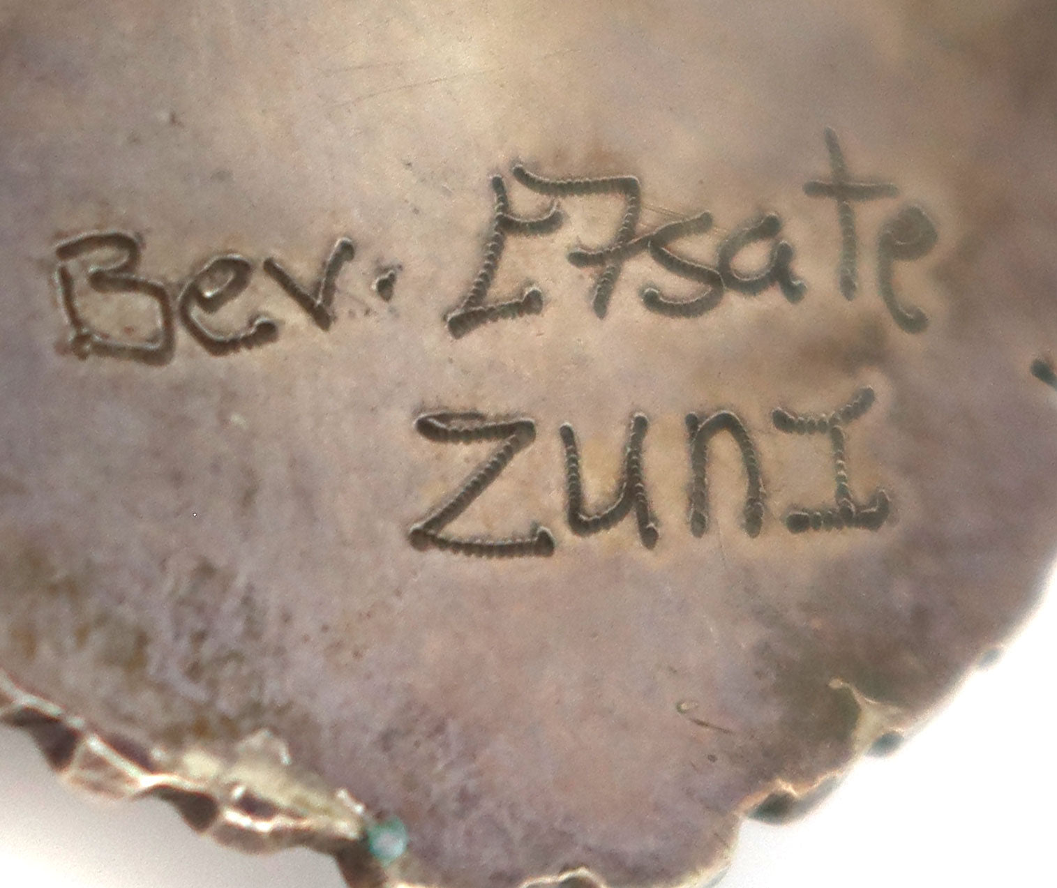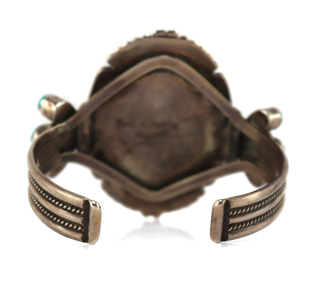 1970-80sMeasurements: (1.) Necklace: 162.7g, 25" length, 5.75" x 2" center pendant. Note: The eye of the upper right pendant is missing a stone. Please see photos. (2.) Bracelet: 47.2g, 2.125" bandwidth, size 6.5 to include a 1" gap. (3.) Ring: 9.9g, size 9, 1.375" x 1.125" face. (4.) Earrings: 10.7g, 2.5" x 1", each. Stones include turquoise, mother of pearl, coral, and jet. Hallmarked by the artist on verso.