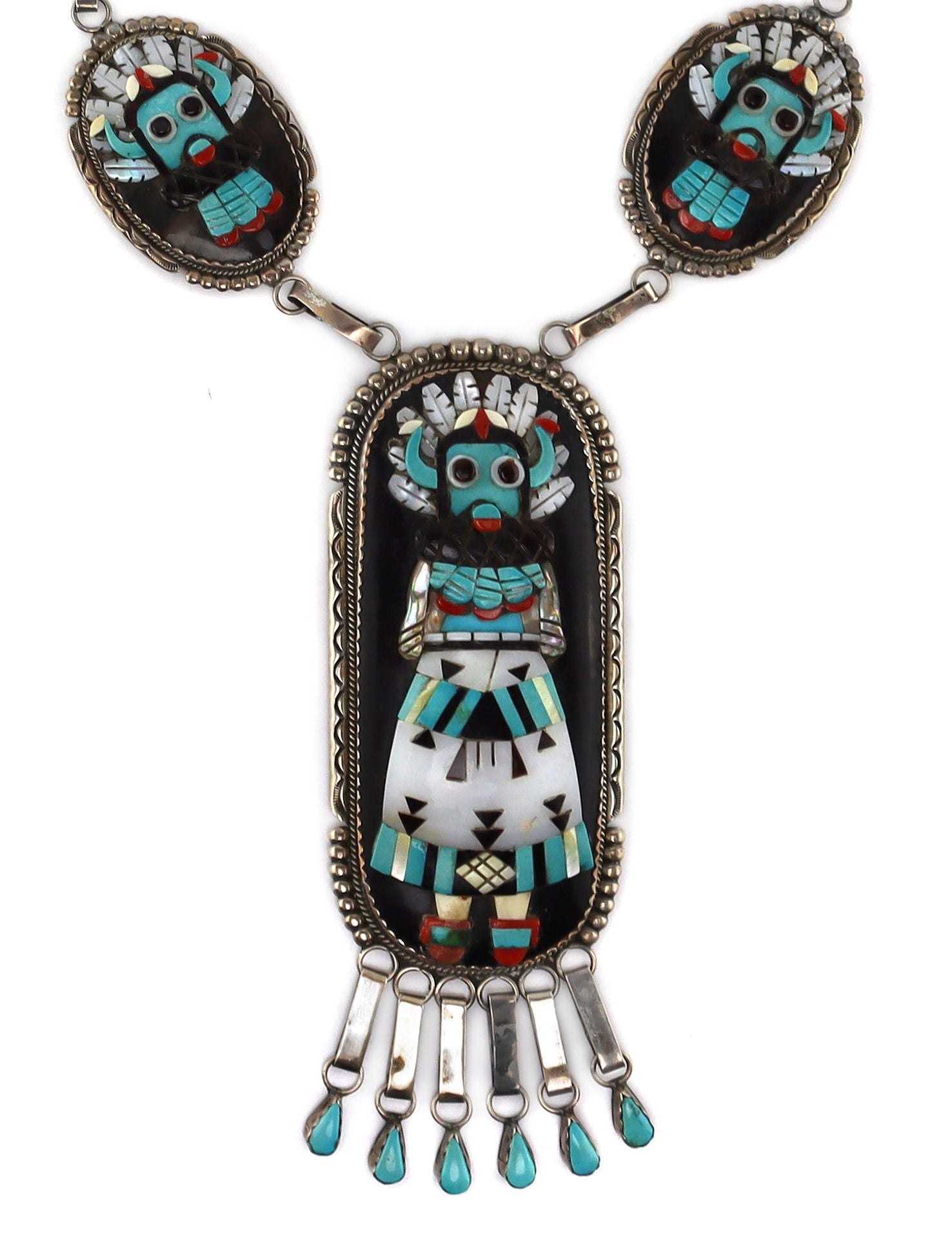 Beverly Etsate - Zuni - Multi-Stone Raised-Inlay and Silver Necklace, Bracelet, Ring, and Clip-on Earrings Set with Kachina Design c. 1970-80s