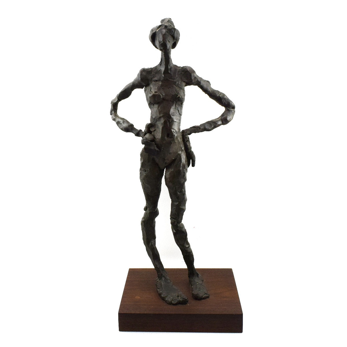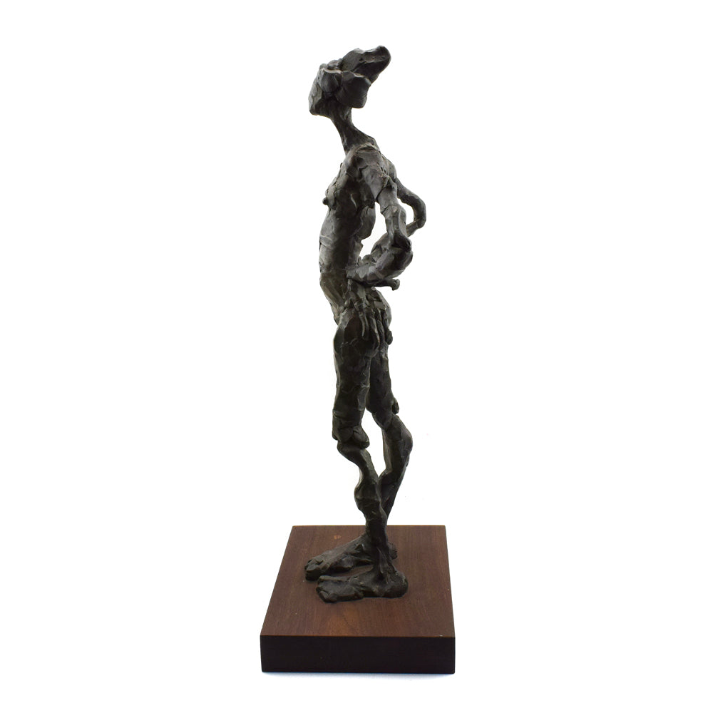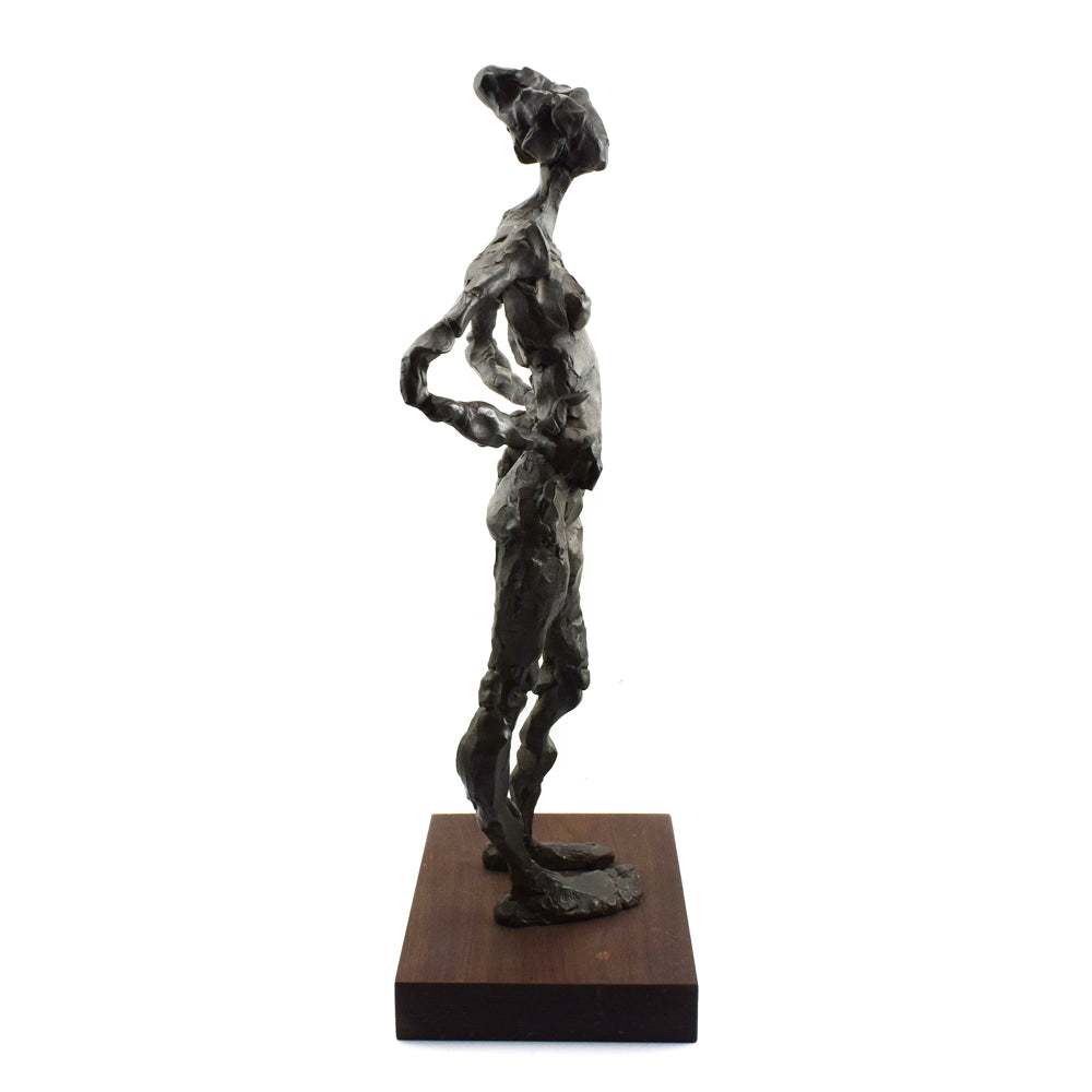 "Standing Figure" was acquired from a private collection in Arizona. It is #2 in an edition of 12. This sculpture is an excellent example of artist Curt Brill's use of form to create work that is visually enticing and aesthetically pleasing from all perspectives - whether it is the graceful shape of the hair, head, and neck when viewed from the side; the texture, relief, and angles when viewed from the back; or the negative space formed with the position of the legs and point of the toes when viewed from the front. 23" x 10.5" x 7", base is 1.75"