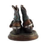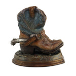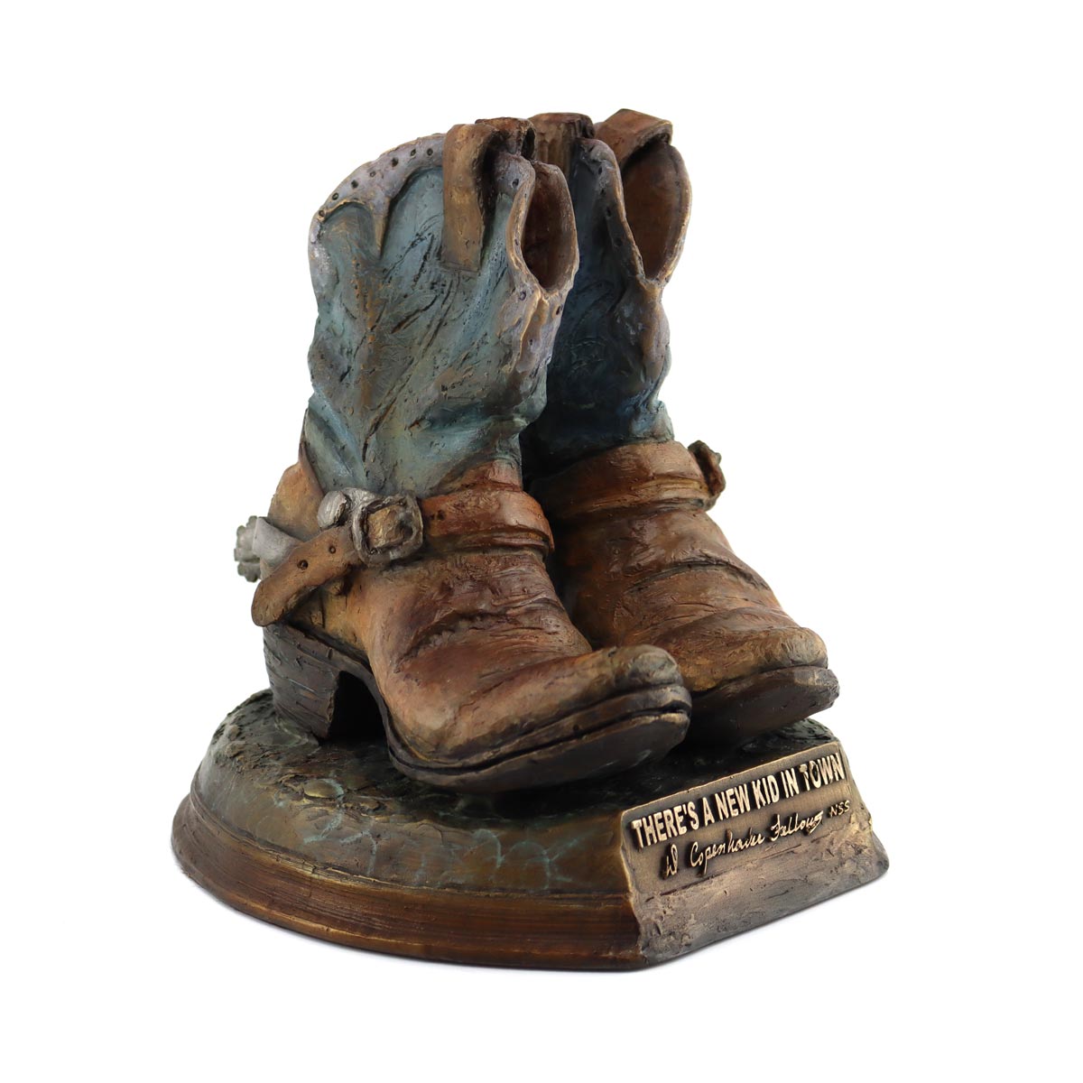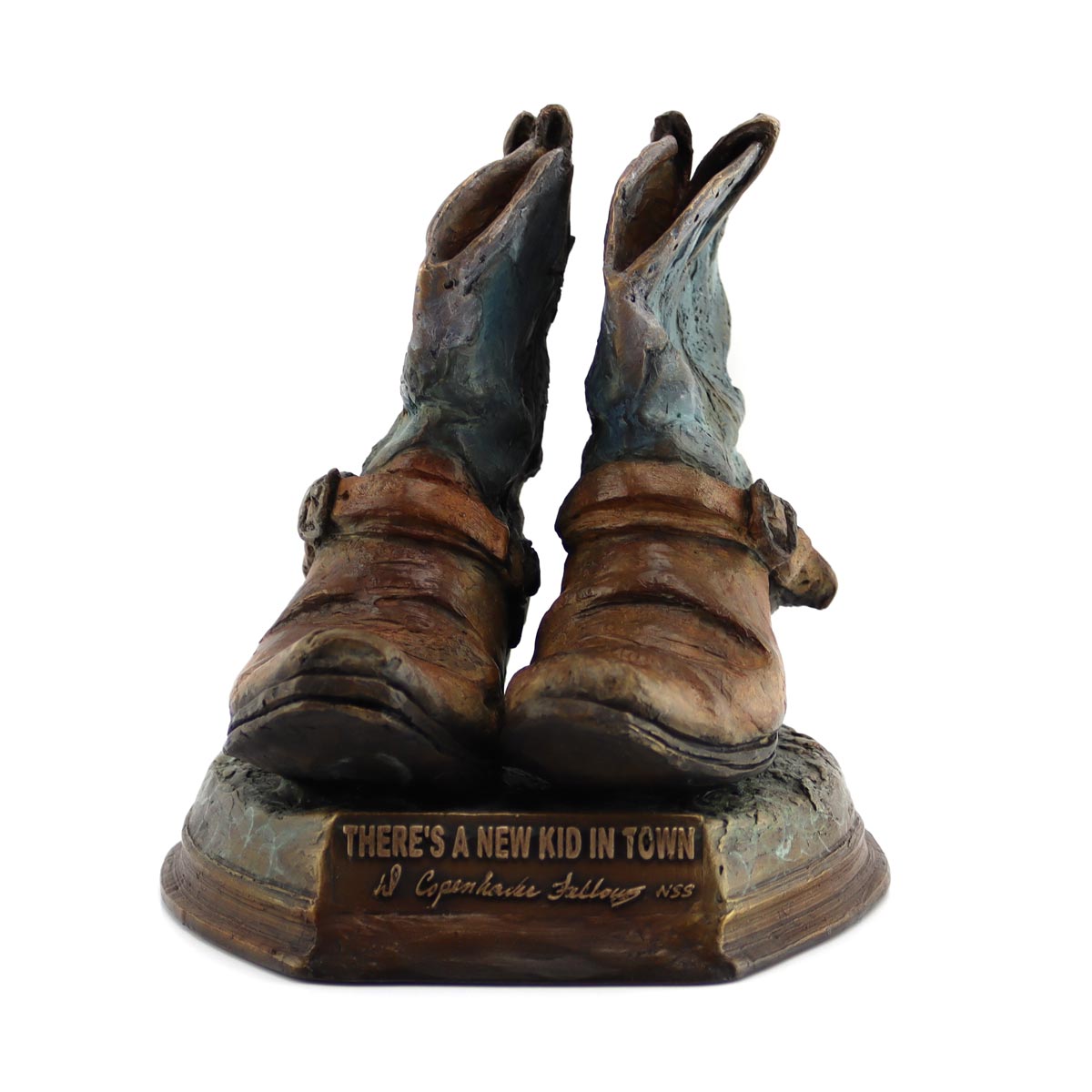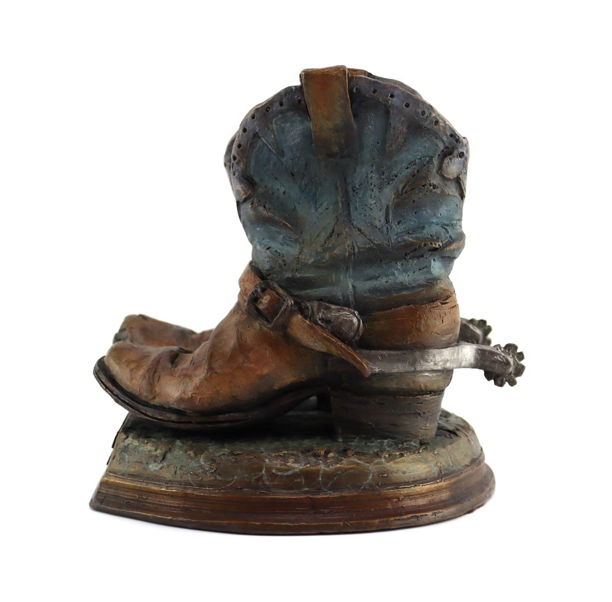 This little pair of boots comes in two patinas. One is blue tones for little cowboys and one is rose tones for little cowgirls. A special order plaque will have child's name and birthdate on the face of the sculpture. "You can tell from the wear on these boots... this kids a hand" - Deborah Copenhaver-Fellows, NSS