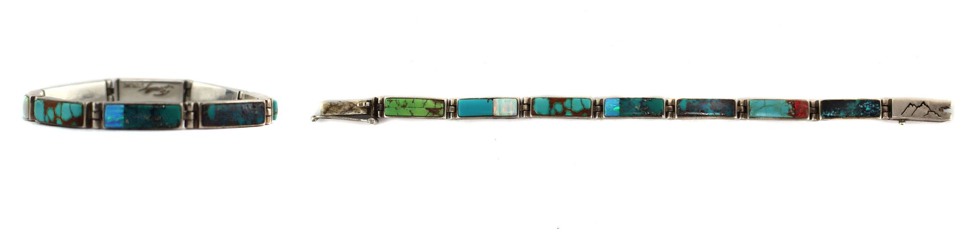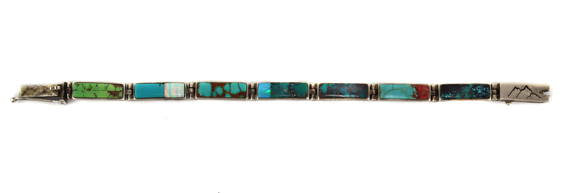 23.2g, 0.25" bandwidth, 7.25" length. Stones include: gaspeite, turquoise, and opal. Artist hallmark on verso. Ex Montana collection.