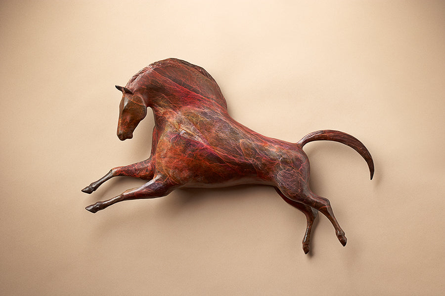 15.5"This style is a three-dimensional version of horses painted and drawn on buffalo robes and teepees in the latter half of the 19th Century on the Western plains of the American continent. Buffalo Robes and Teepees of the Native American Plains tribes were often decorated with images that represented events and personal accomplishments. These included horses and buffalo among the various designs. There was a particular style that was used, and this style was also discernable in the 'Ledger Art'... similar drawings put down on discarded book pages and ledgers that found their way into the hands of the Indian artists who created these designs." - Star Liana York