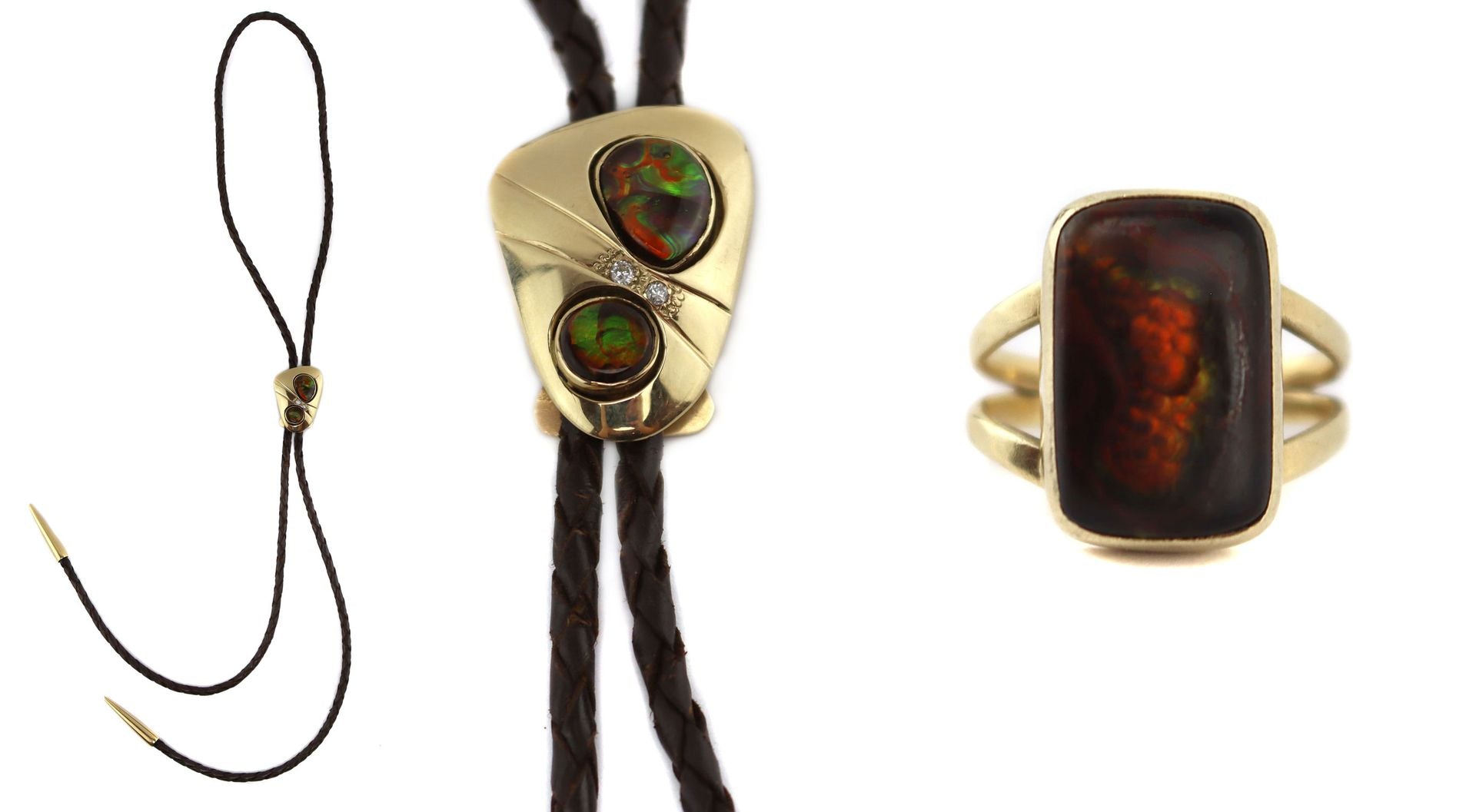 H. Cortez - Navajo - Fire Agate, Diamond, and 14K Gold Bolo Tie and Ring Set c. 1960-70s