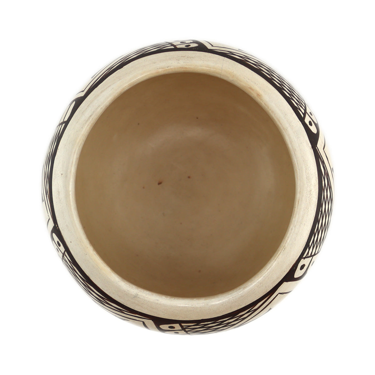 This pottery is in very good condition, with slight surface wear. Signed by the artist on the bottom. Helen Naha is the daughter in law of Paqua Naha ( the first Frog Woman). She is noted for her white clay slip and based her designs on pottery fragments found at the ruins of First Mesa Hopi. Ex King Gallery. Ex Arizona collection.