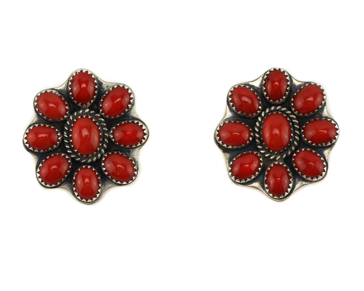 Jeanette Dale (b. 1949) - Navajo - Coral Cluster and Sterling Silver Clip-On Earrings c. 1970s, 1.25" x 1.25"