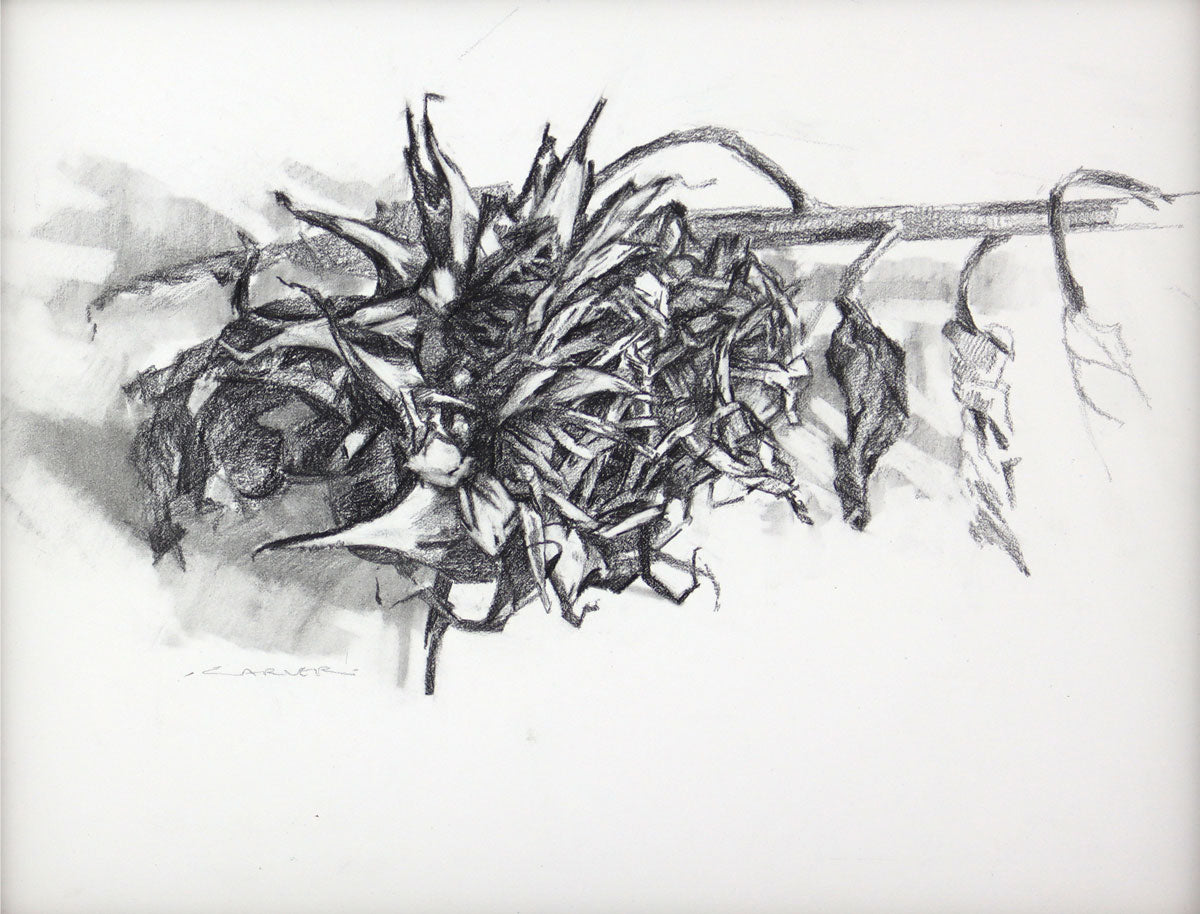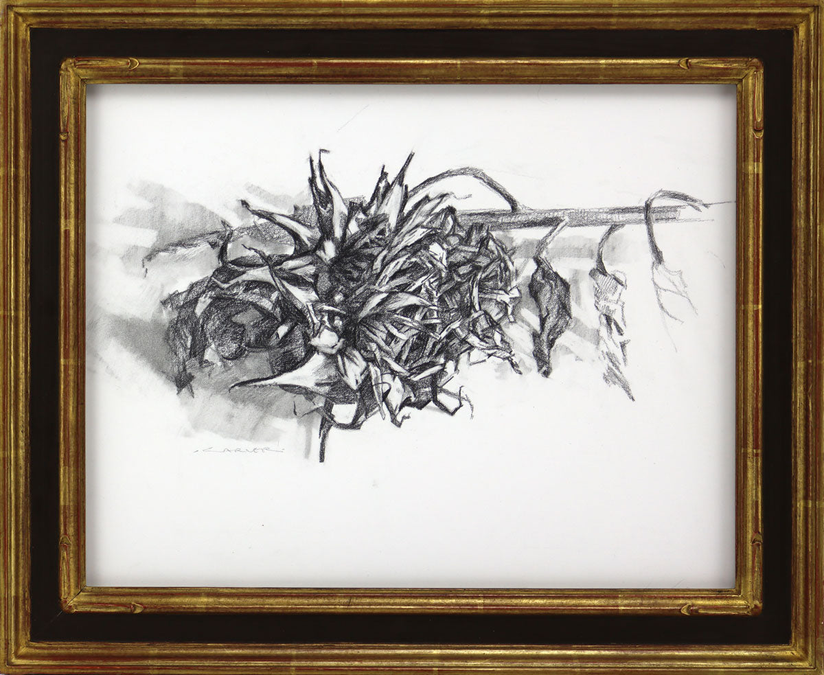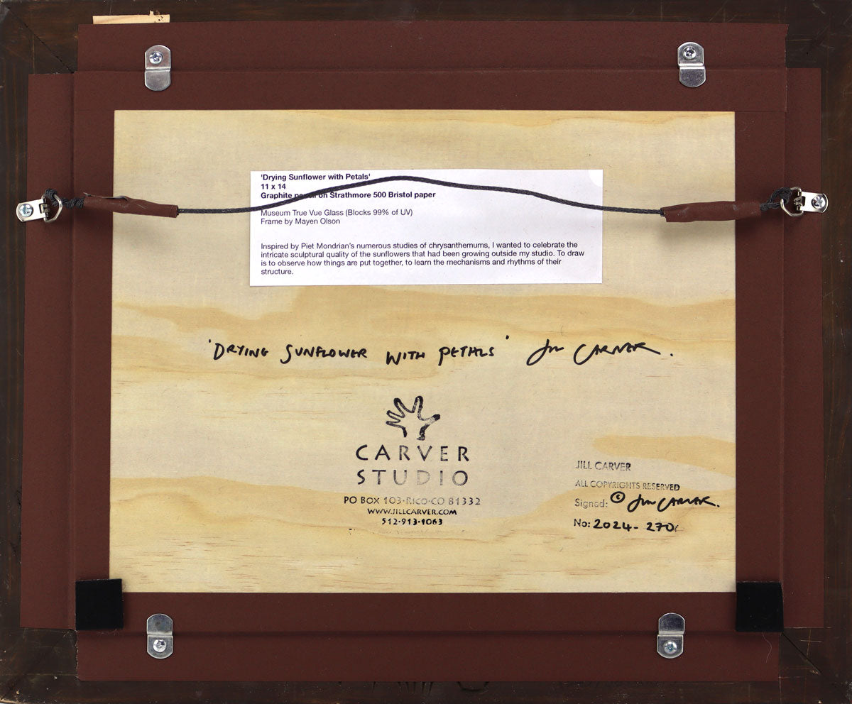11.012.125" x 17.25" framed. "Inspired by Piet Mondrian's numerous studies of chrysanthemums, I wanted to celebrate the intricate sculptural quality of the sunflowers that had been growing outside my studio. To draw is to observe how things are put together, to learn the mechanisms and rhythms of their structure." - Jill Carver.