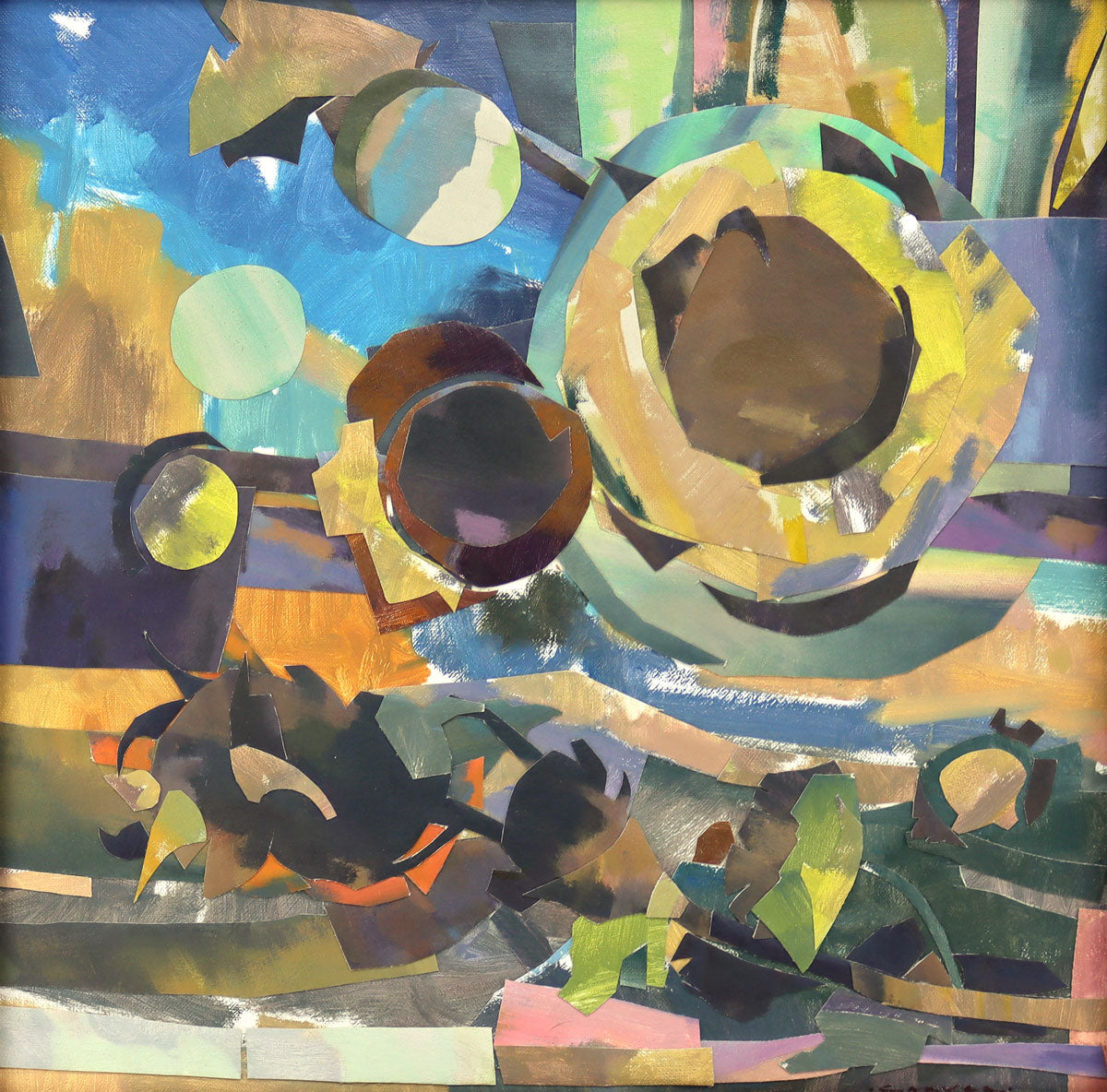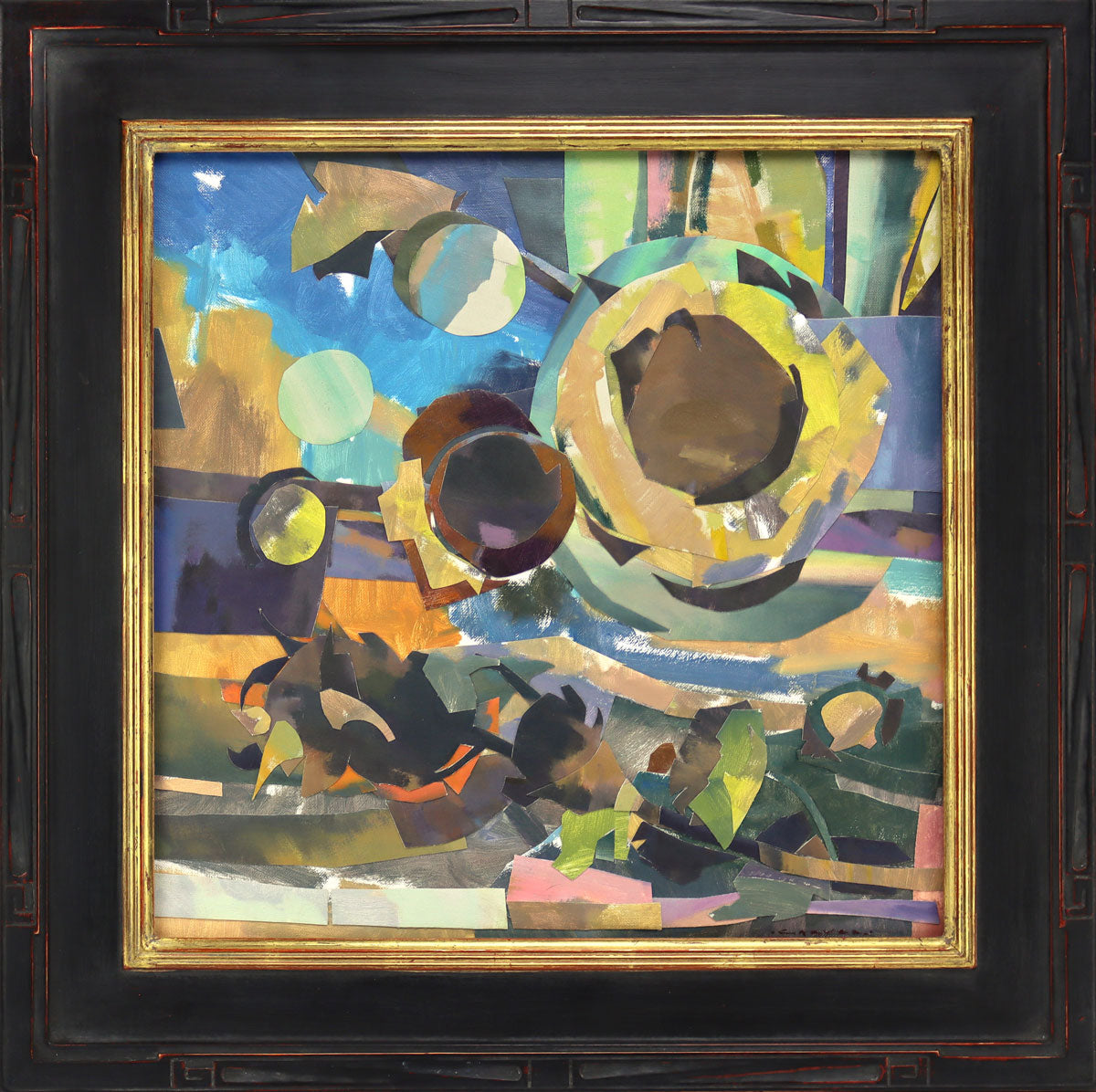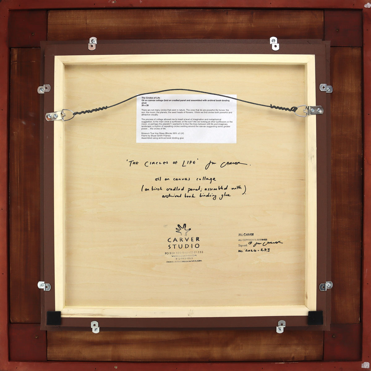 20.027.25" x 23.25" framed. "This piece was created using oil over a canvas collage. It was laid on cradled panel and assembled with archival book-binding glue. From the artist: There are not many circles that exist in nature. The ones that do are powerful life forces: the sun, the moon, the planets, the seed heads of flowers. I think we find circles both powerful and attractive visually. the process of collage allowed me to insert a level of imagination and metaphorical suggestion. Is the main circle a sunflower, or the sun? Are we looking at other sunflowers the moon, or perhaps the planets? I wanted to blur the lines between still life and imaginary landscape; a rhythm of repeating circles swirling around the canvas suggesting some greater power... The Circles of Life." - Jill Carver.