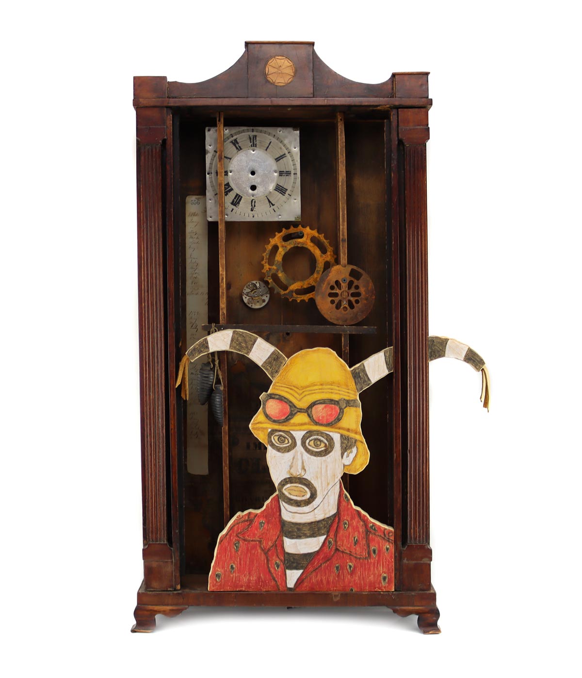Vintage clock case, wood, colored pencil, clock parts and gears.