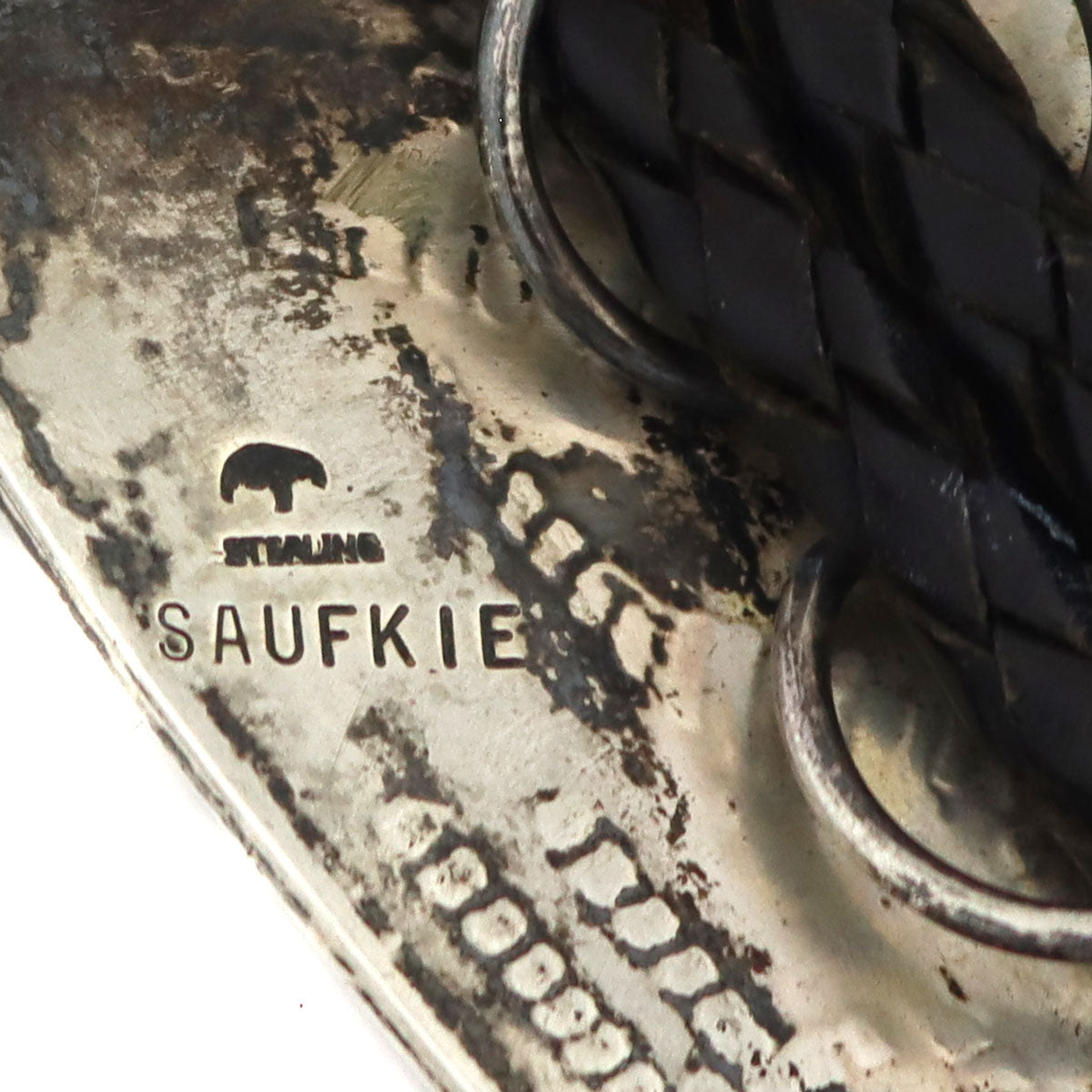 Lawrence Saufkie (1934-2011) - Hopi - Sterling Silver Overlay and Leather Bolo Tie with Bear Claw Pictorial Design c. 1950-60s, 39" length