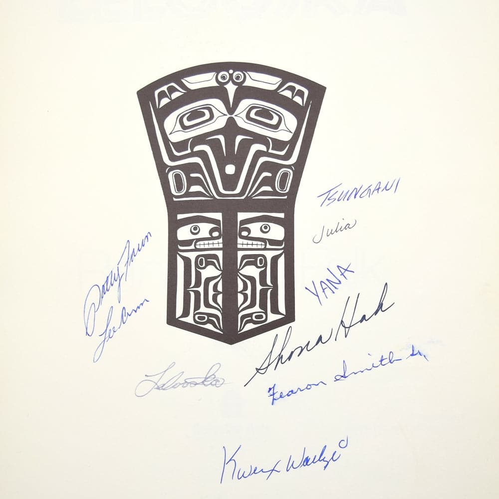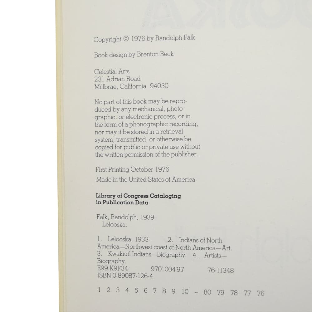 Copyright 1976. Published by Library of Congress Cataloging in Publication of Data. 144 pages. Excellent condition. Signed by Lelooska family. Ex Rex Arrowsmith Estate: a long-time Native American trader and art dealer, who owned a shop in Santa Fe, New Mexico Relics of the Old West, which opened off the Old Santa Fe Trail in 1950. He also participated as a judge at the Santa Fe Indian Market for many years. He also served as president of SWAIA, Southwestern Association for Indian Arts.