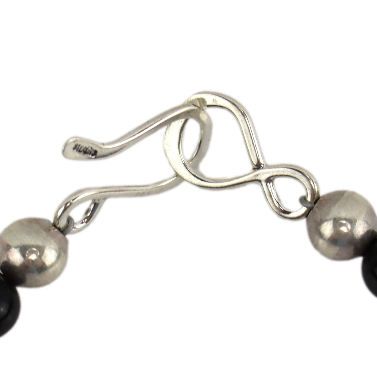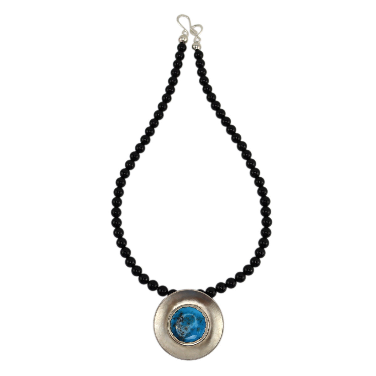 Miramontes - Morenci Turquoise with Pyrite Inclusions on Sterling Silver Disk with Onyx Beads, 24" length