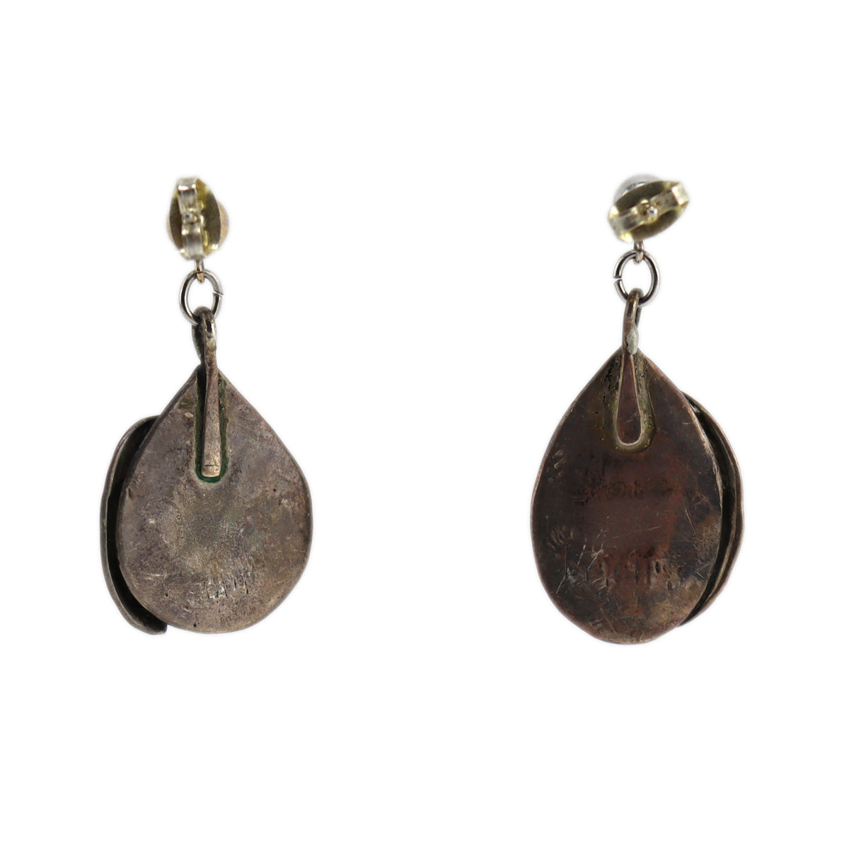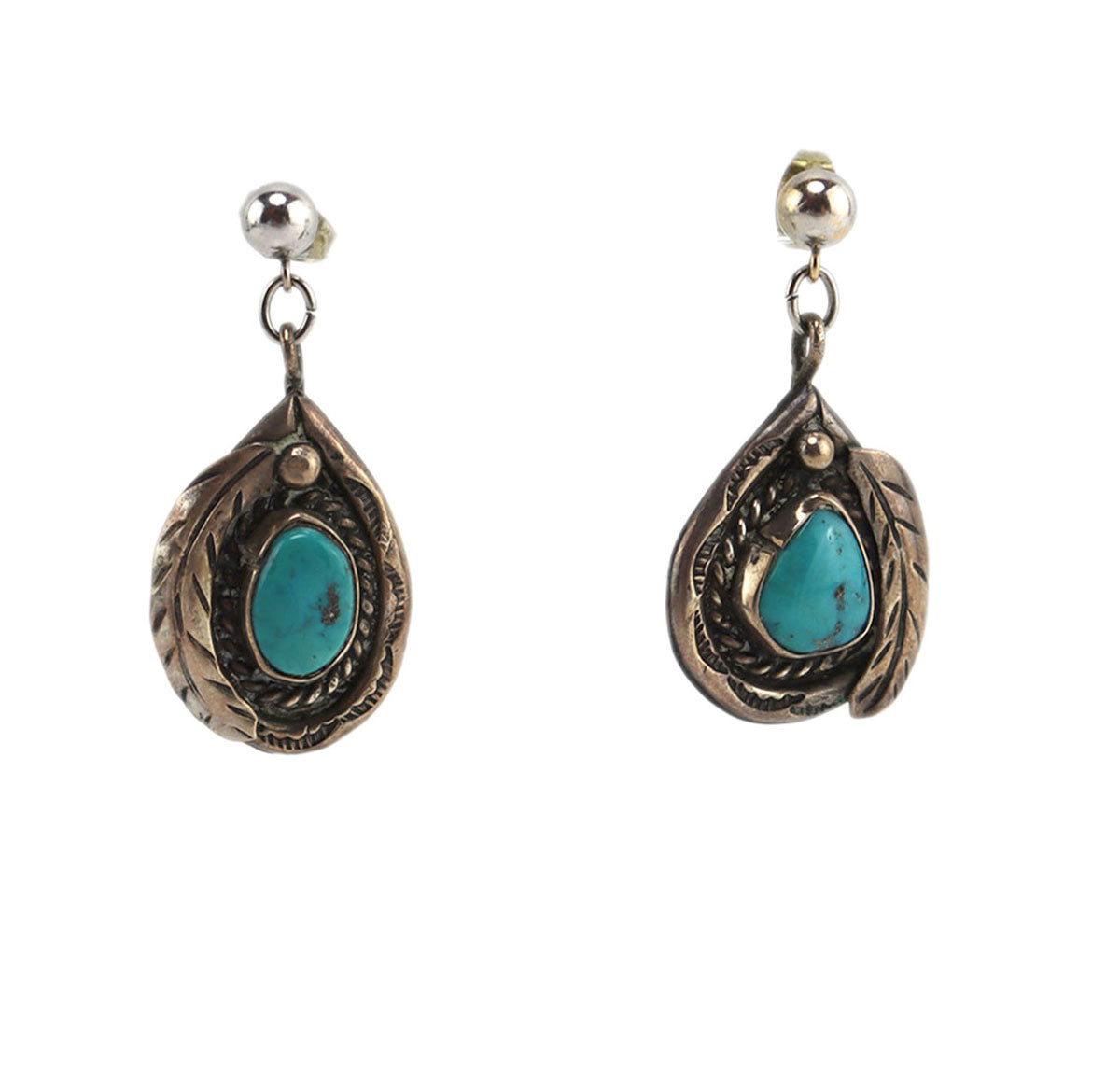 Navajo - Turquoise and Silver Post Dangle Earrings with Feather Design c. 1960s, 1.5" x 0.875"
