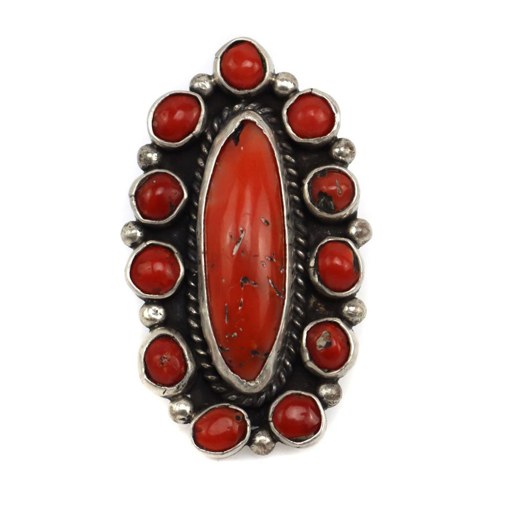 Navajo - Coral Cluster and Silver Ring c. 1970-80s, size 6.5