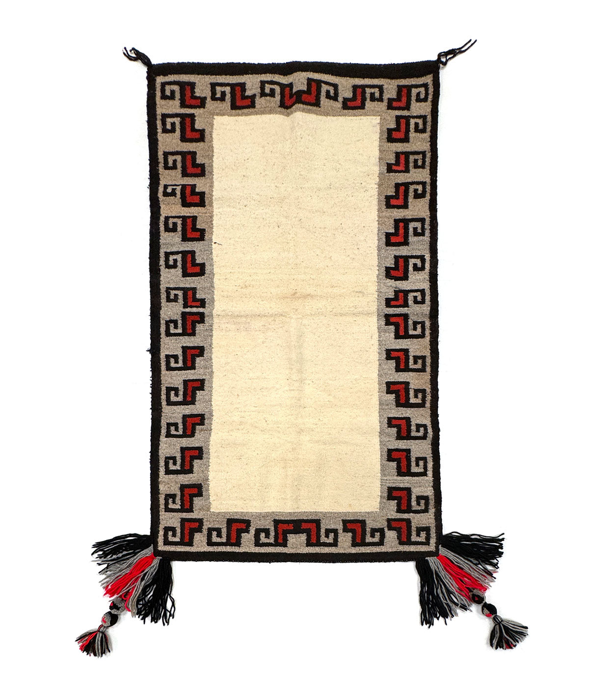 This weaving is in very good condition, with a few faint spots, and minor weft wear. The corners and tassels are nicely intact.