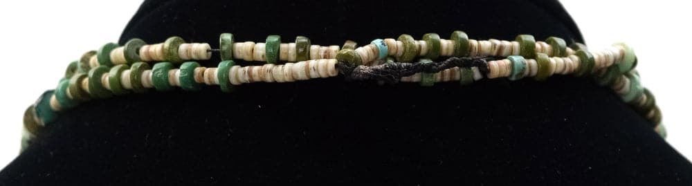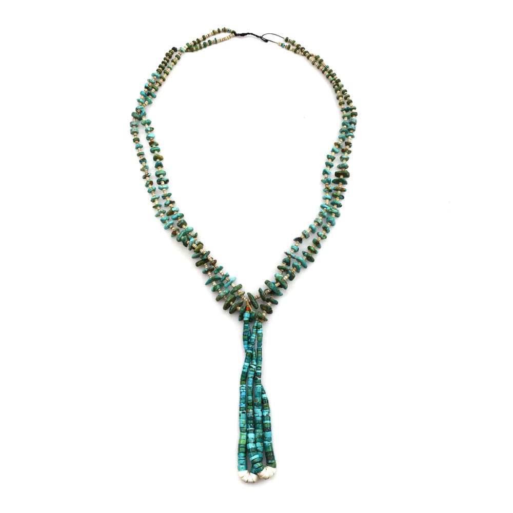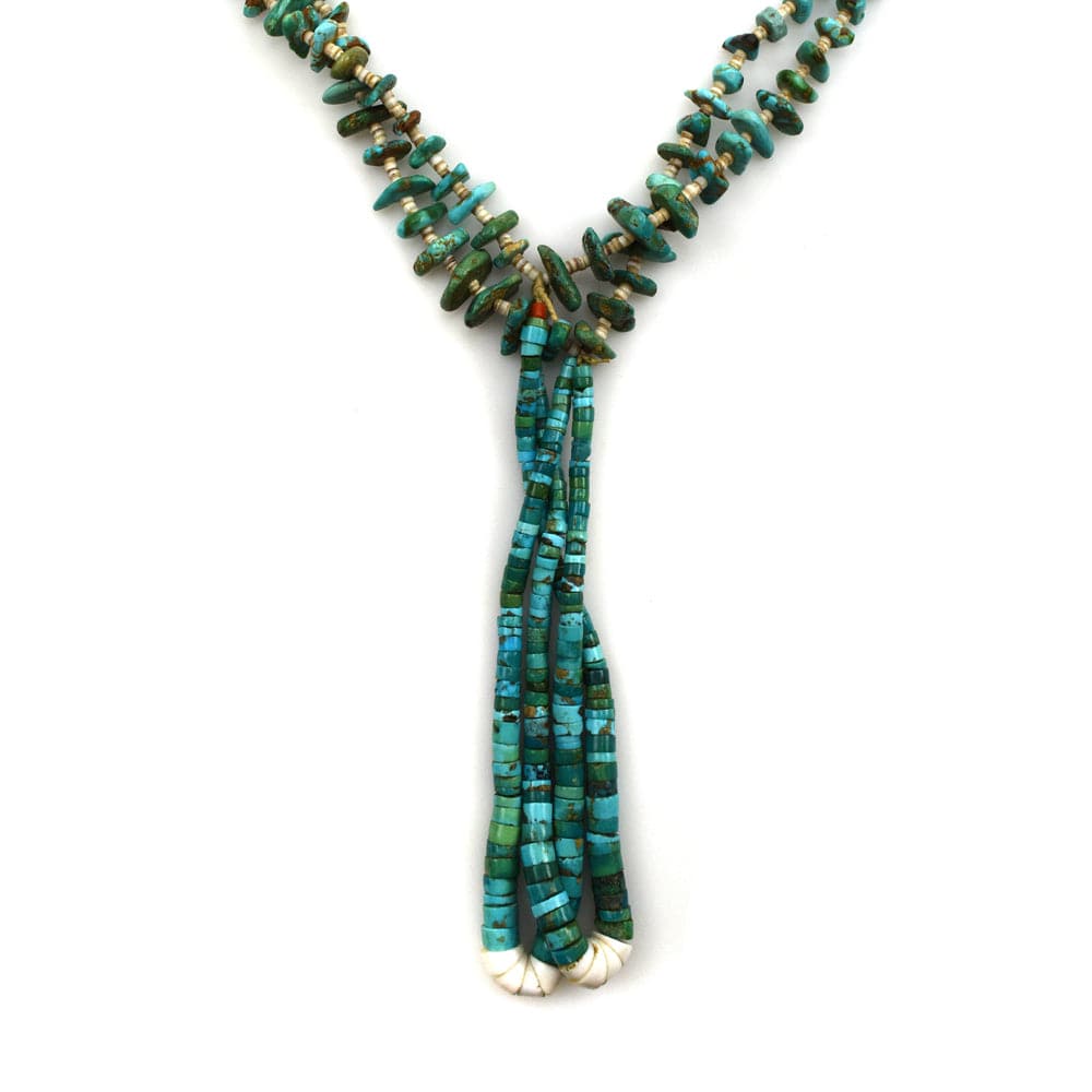 110.8g,, 28" chain length, joclas measure 5.5". Acquired from a private collection in Arizona. The word "heishi" means "shell," although today it is often used to describe the cut style of beads that are small, flat, disc-shapes. "Jocla" is the Navajo word for "ear string." It is sometimes also spelled "jacla" or "joclah." The Navajo and Pueblo natives would often wear all their jewelry for safekeeping on their person. So their extra "ear strings" or earrings, were often tied to the bottom of their necklaces. Later, this evolved into a necklace style.
