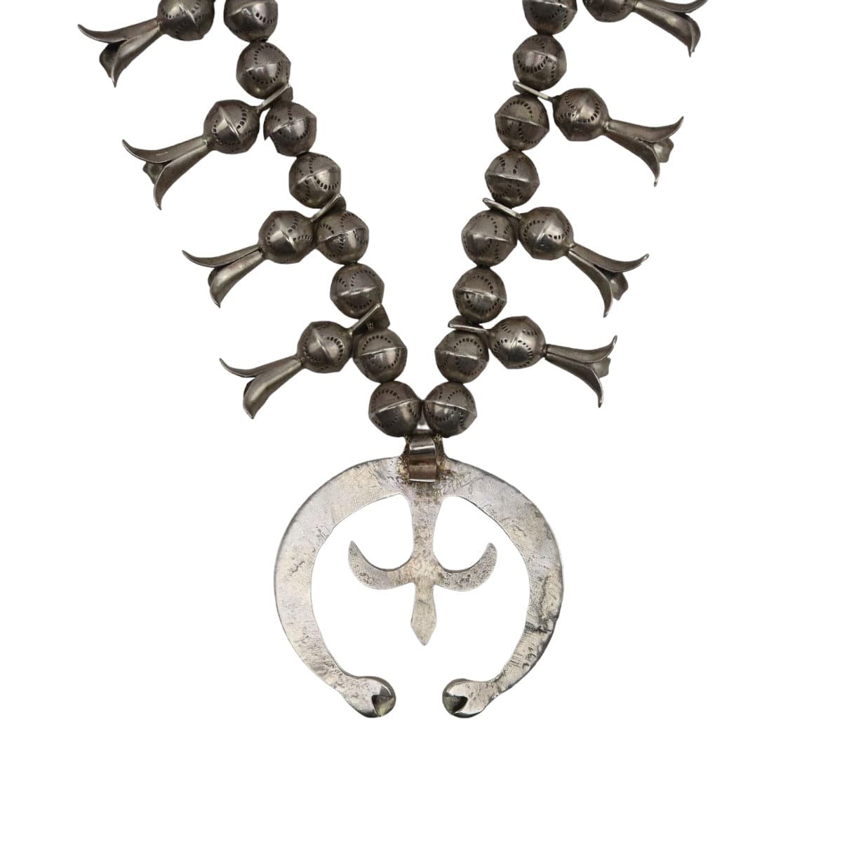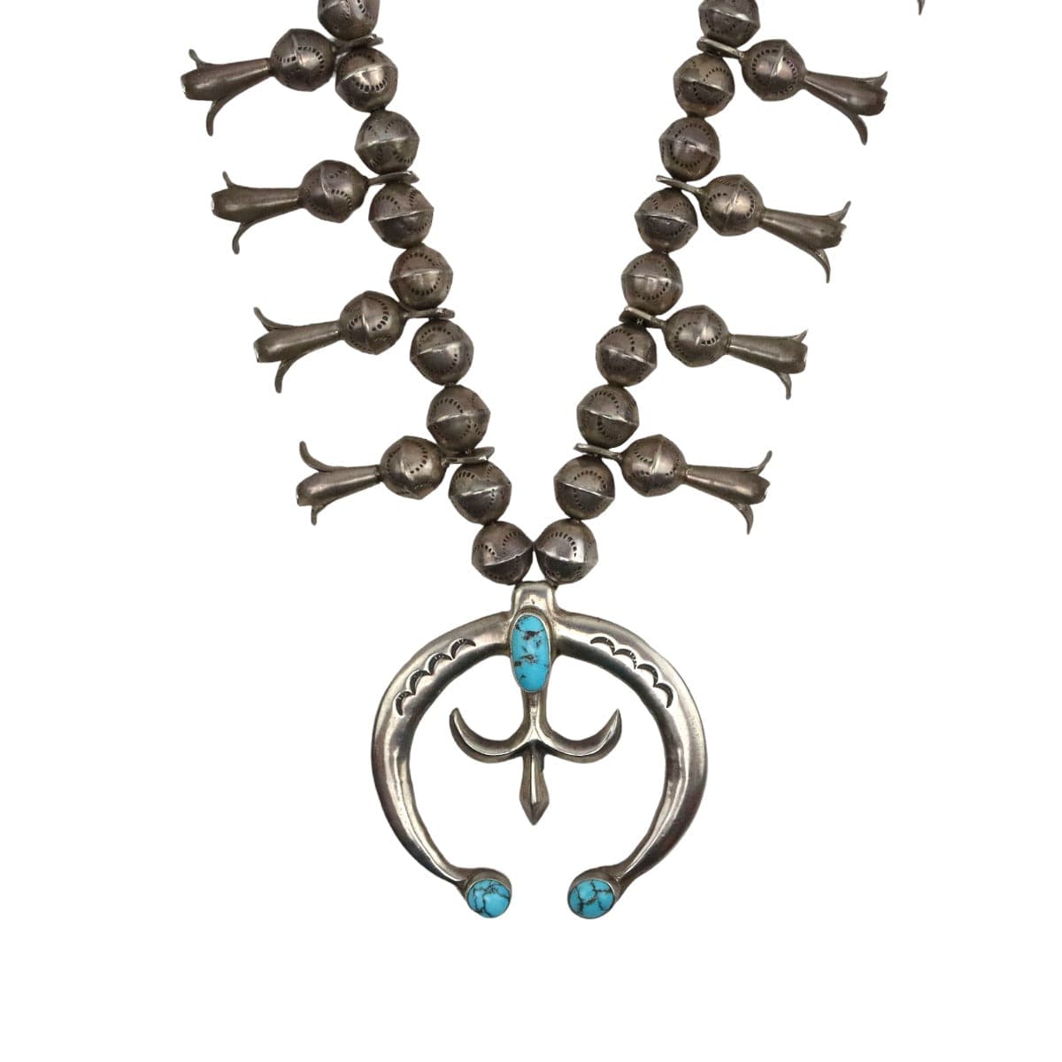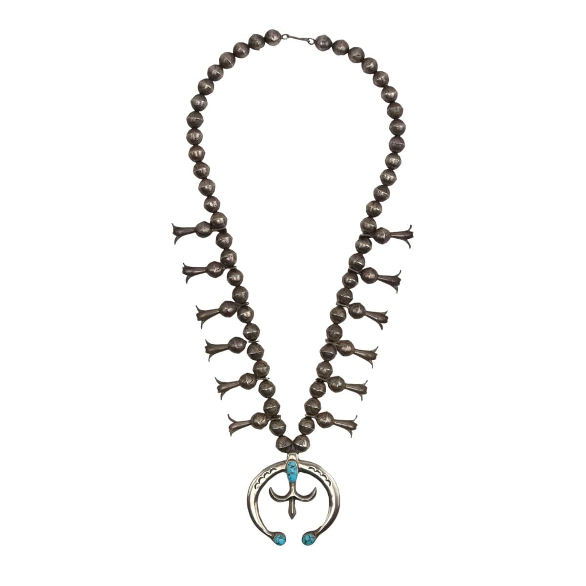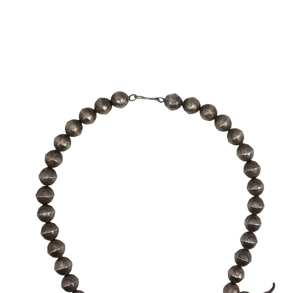Navajo Number 8 Turquoise and Silver Beaded Squash Blossom Necklace c. 1940-50s, 25" length (J15076-CO-038)