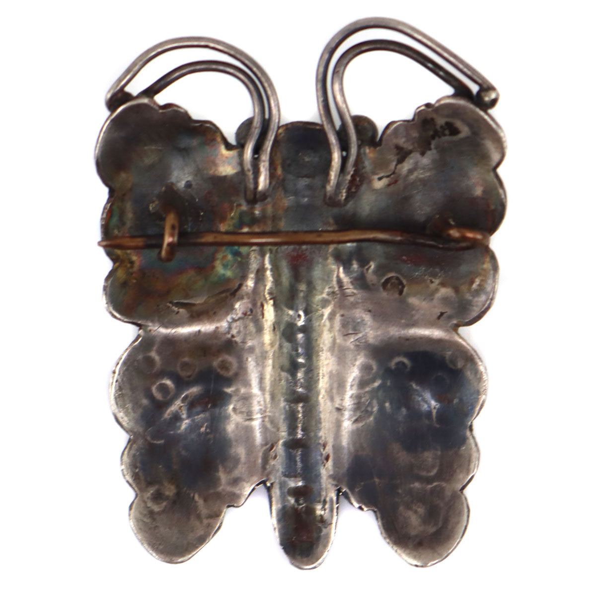 Navajo - Turquoise and Silver Butterfly Pin with Stamped Design c. 1930-40s, 2" x 1.5"