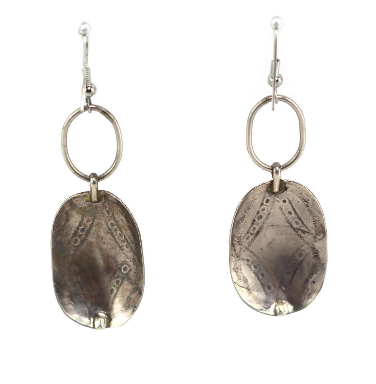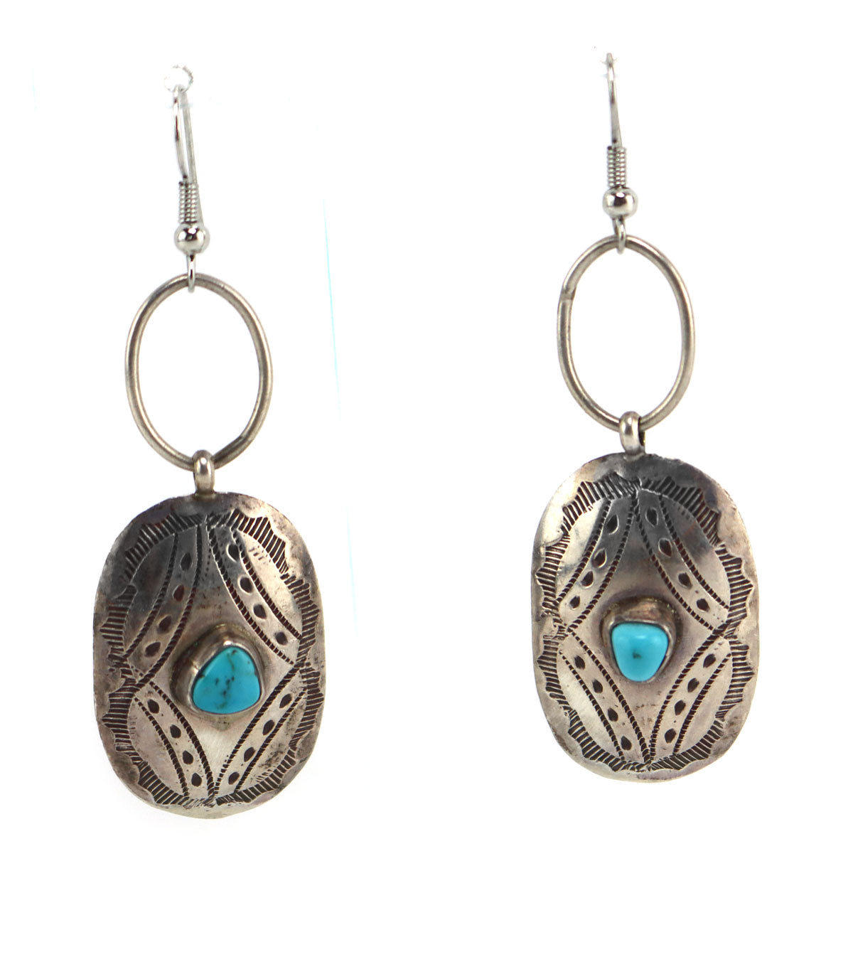 Navajo - Turquoise and Silver Concho-Style French Hook Earrings with Stamped Design c. 1960s, 2.5" x 0.75"