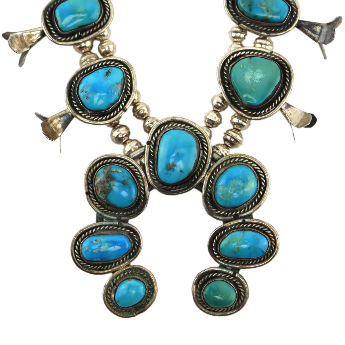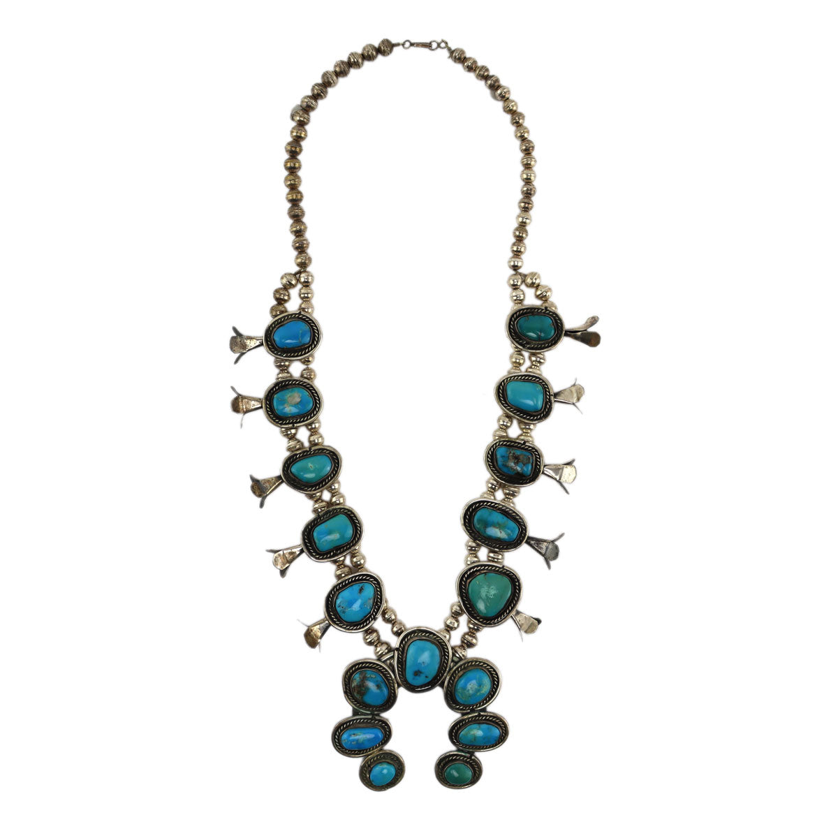 Navajo - Turquoise and Silver Squash Blossom Necklace c. 1960-70s, 24" length