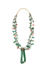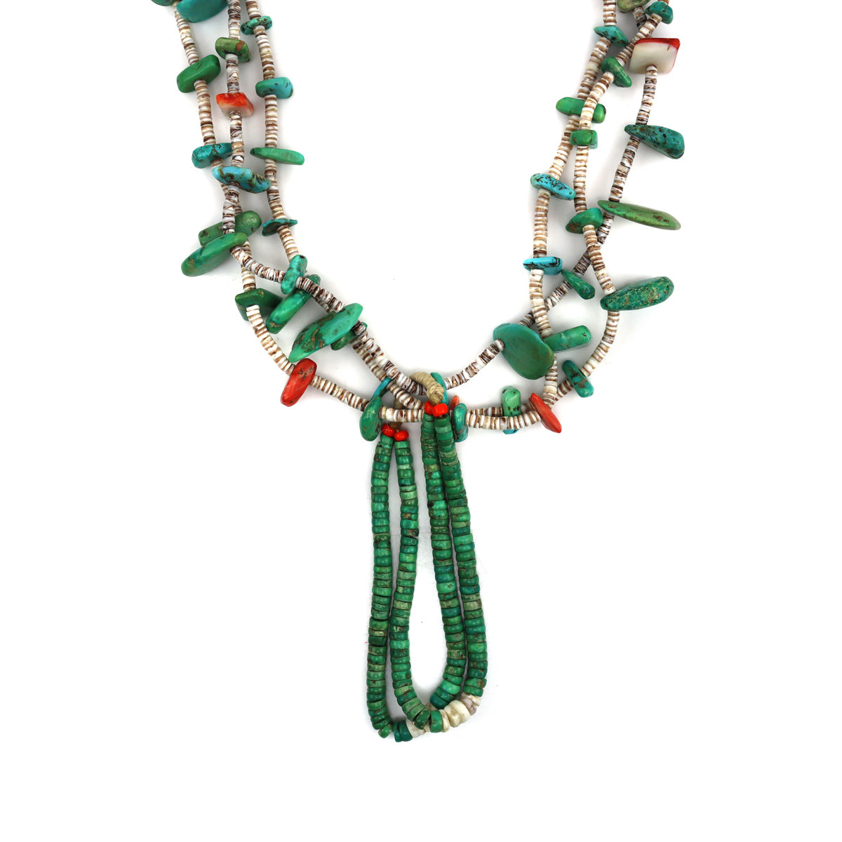 Navajo Turquoise and Spiny Oyster Heishi Three-Strand Necklace with Joclas c. 1940s, 28" length (J15051)